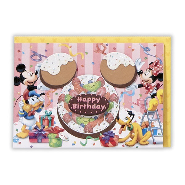 ・ミッキーと仲間たちが大きな誕生日ケーキと共にお祝いするにぎやかで楽しいデザインのカードです