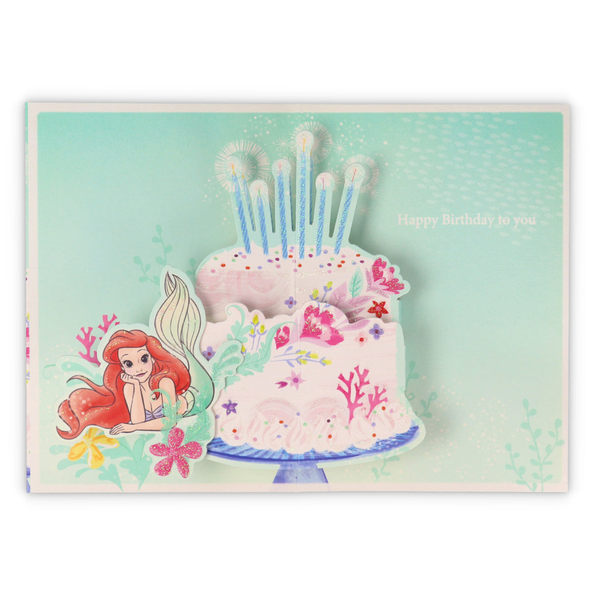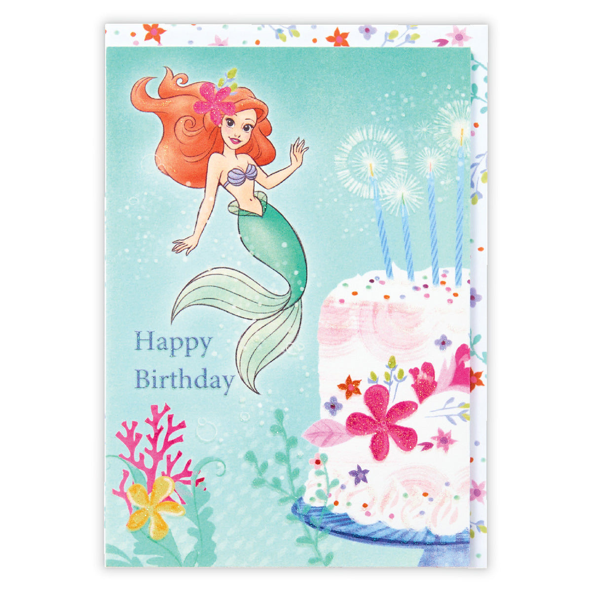 「リトルマーメイド」のアリエルが、花をあしらったケーキと一緒にお祝いしてくれる立体バースデーカードです。ラメ加工のきらめきが華やかな誕生日を演出します。