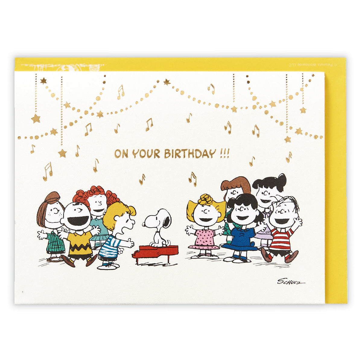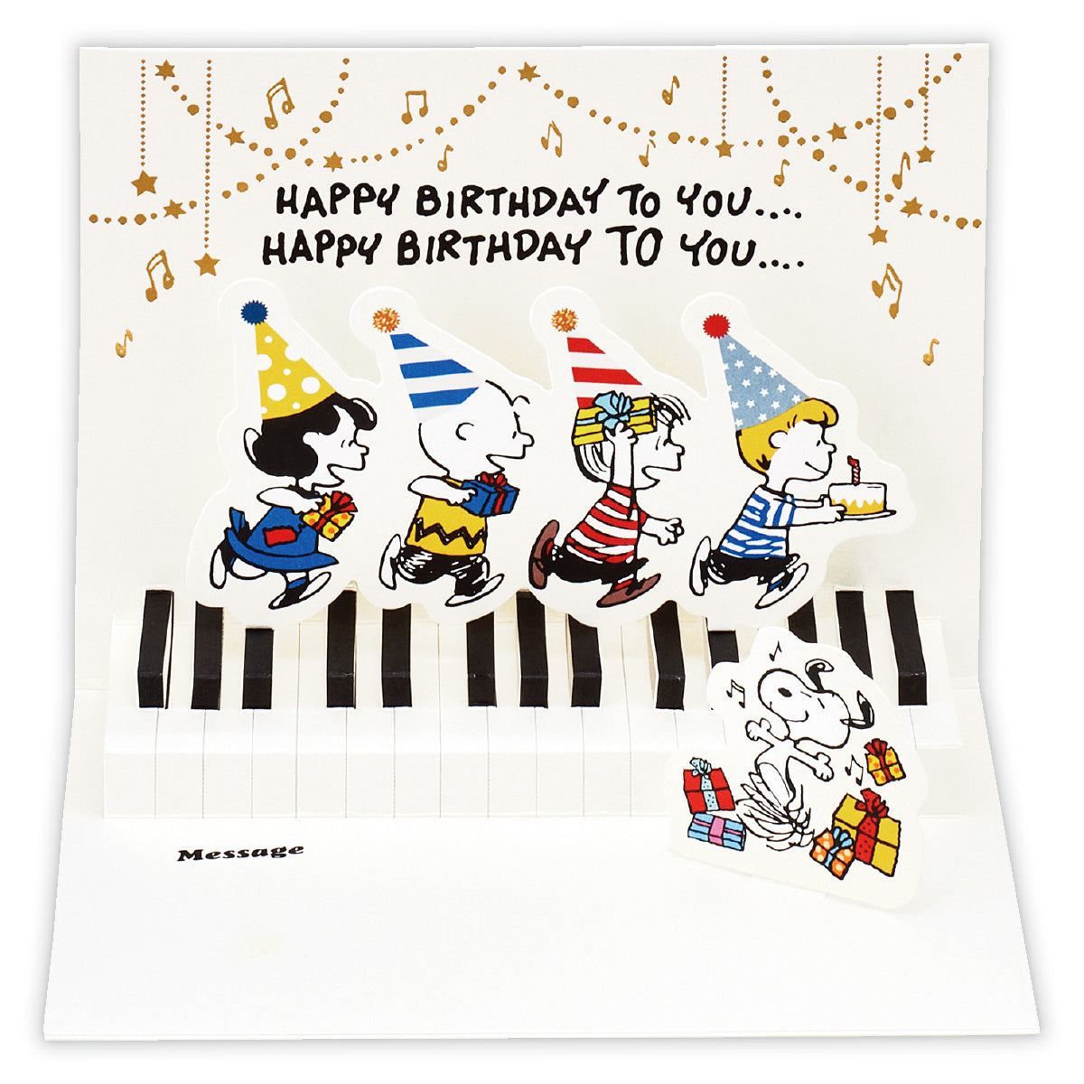 カードを開くと、鍵盤の上を走り回るスヌーピーと仲間たちが現れる立体バースデーカードです。ピアノや音符など音楽に関連するモチーフと共に、心温まるお誕生日会の様子を描きました。