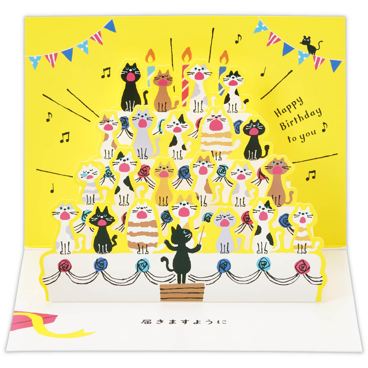 カードを開くとバースデーソングを熱唱するたくさんの猫が飛び出す立体カード。さまざまな模様の猫が描かれたにぎやかなデザインです。