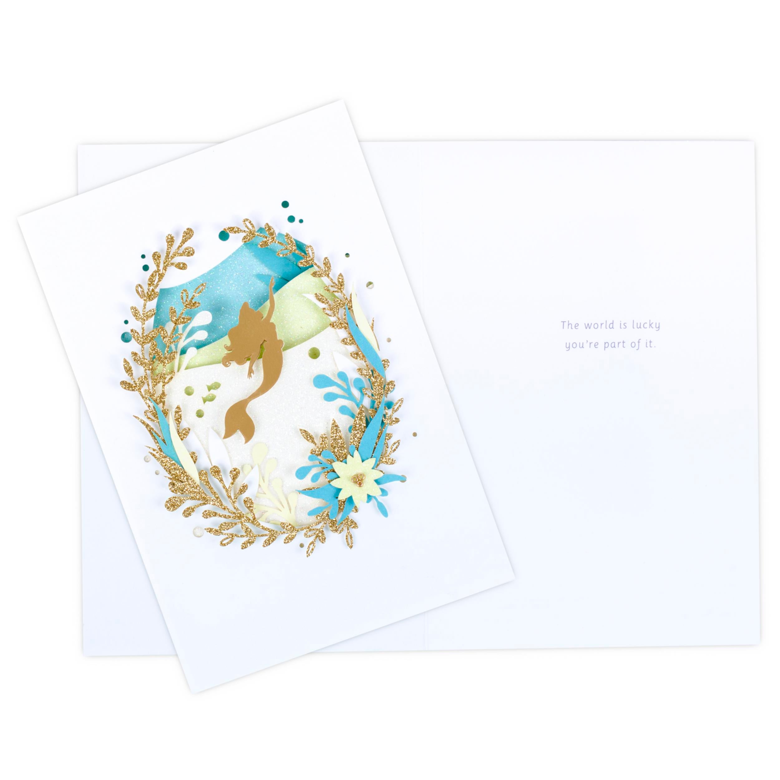 あなたがこの世界にいてくれてよかった。お誕生日はもちろん、なにかを成し遂げたときや、快気祝いなど様々なシーンで相手へあたたかな気持ちを伝えられるカードです。ディズニー「リトル・マーメイド」のアリエルのシルエットがあしらわれています。
