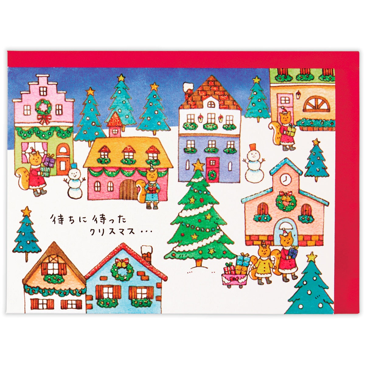 イラストレーターEriyが爪楊枝で描く「タイニー・アニマル・テイル」シリーズのクリスマスカード。小さなりすたちが暮らすクリスマスの町を、絵本のようにほっこり心温まる世界観で描きました。