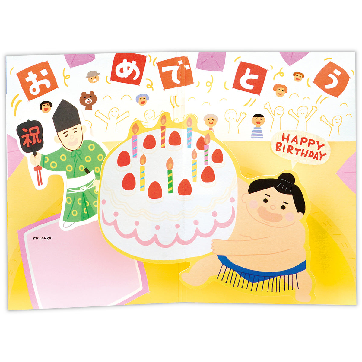 おすもうさんが大きなケーキと一緒にお祝いしてくれるオルゴールカード。相撲の取組をイメージしたこだわりのオリジナル音源にも注目です。