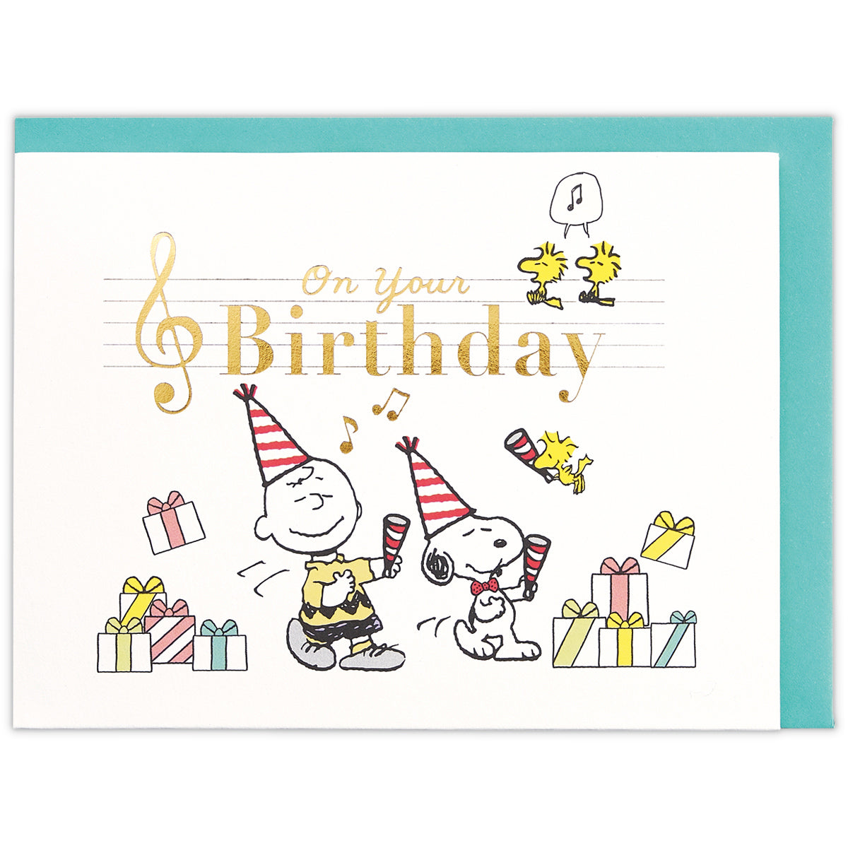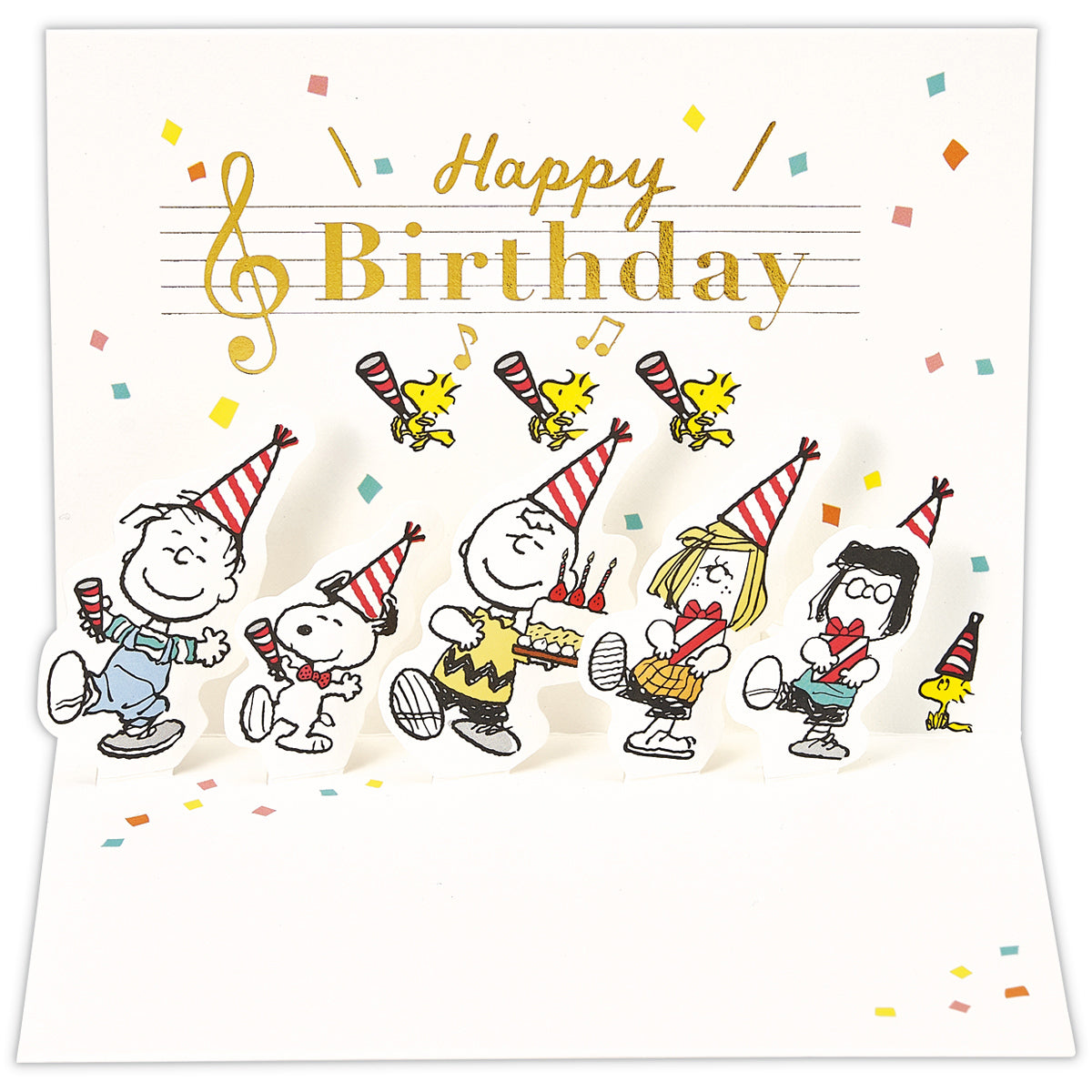 スヌーピーと仲間たちがクラッカーと一緒に誕生日のお祝いを盛り上げます! 楽しくにぎやかなパーティーの雰囲気を感じさせるデザインです。