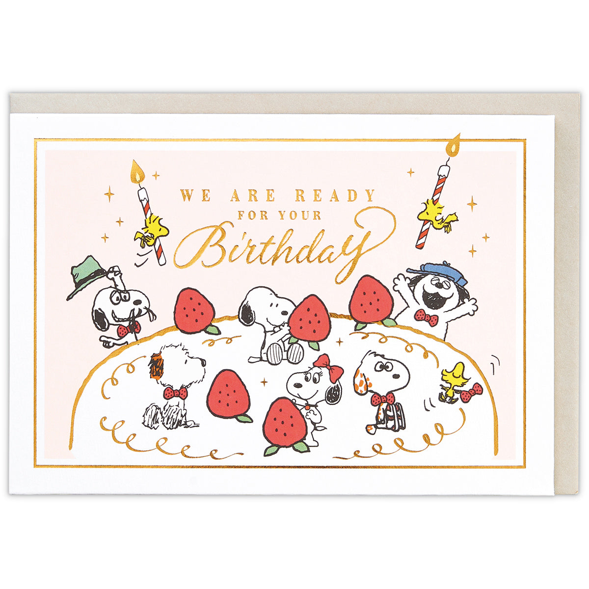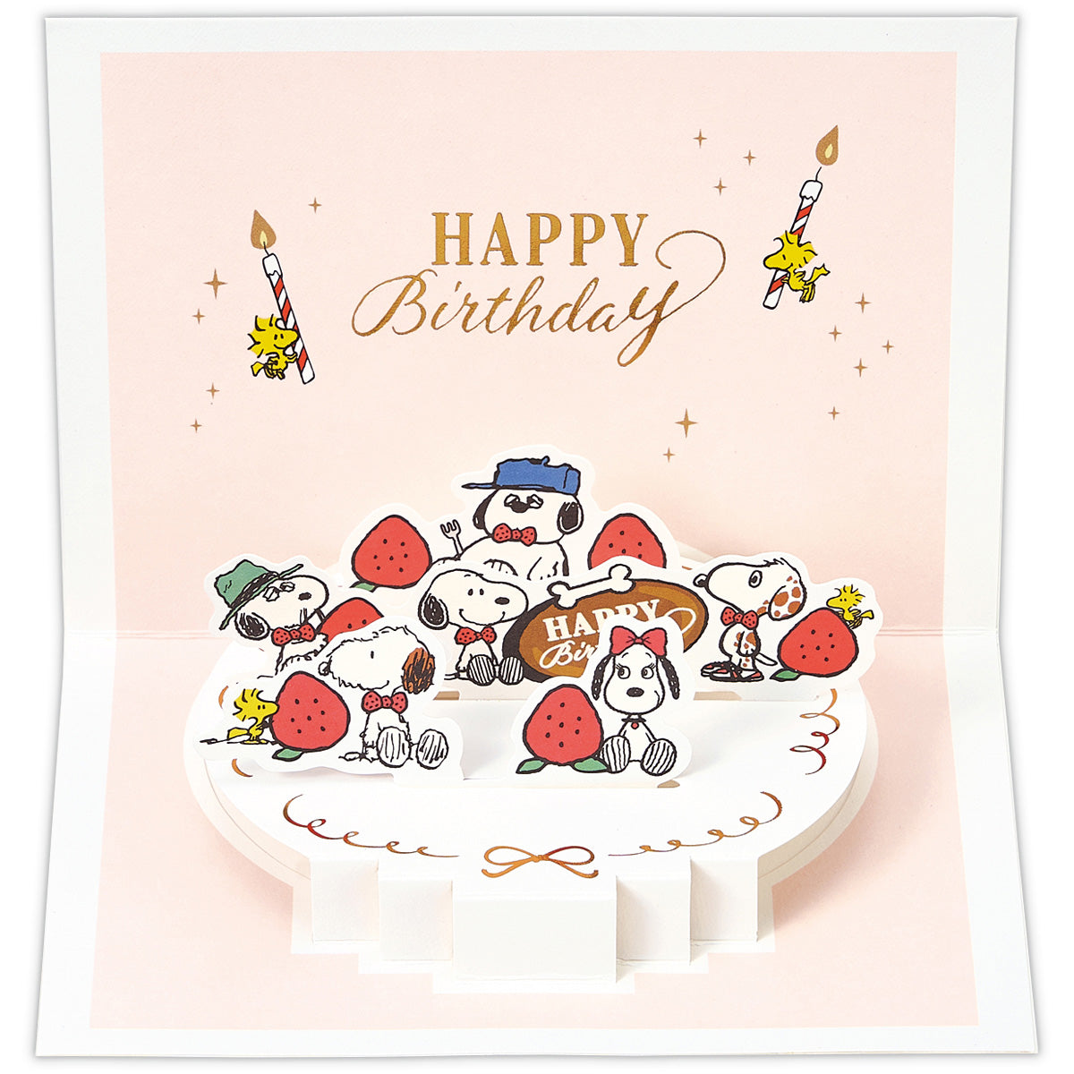 大きなホールケーキにちょこんと座るスヌーピーときょうだいが可愛らしいバースデーカード。ウッドストックもろうそくを抱えてお祝いに駆け付けます!