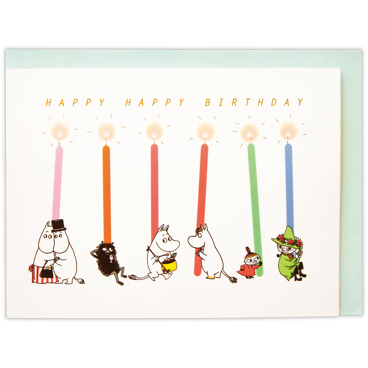 カードを開くと、キャンドルを持ったムーミンたちとバースデーケーキが現れるポップアップカード。色とりどりのキャンドルと楽しそうなムーミンたちの姿が、特別な誕生日を演出してくれます。