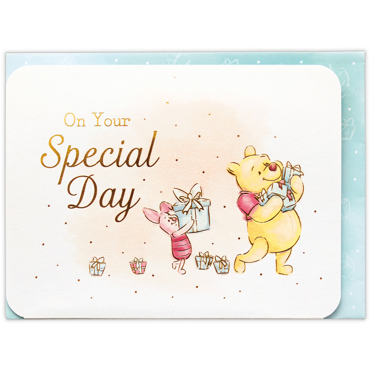 プレゼントを運んでお祝いの準備をするプーさんや仲間たちを、やわらかな色合いで描いた心あたたまるバースデーカード。淡く優しいトーンに繊細な金箔加工が映えるデザインです。