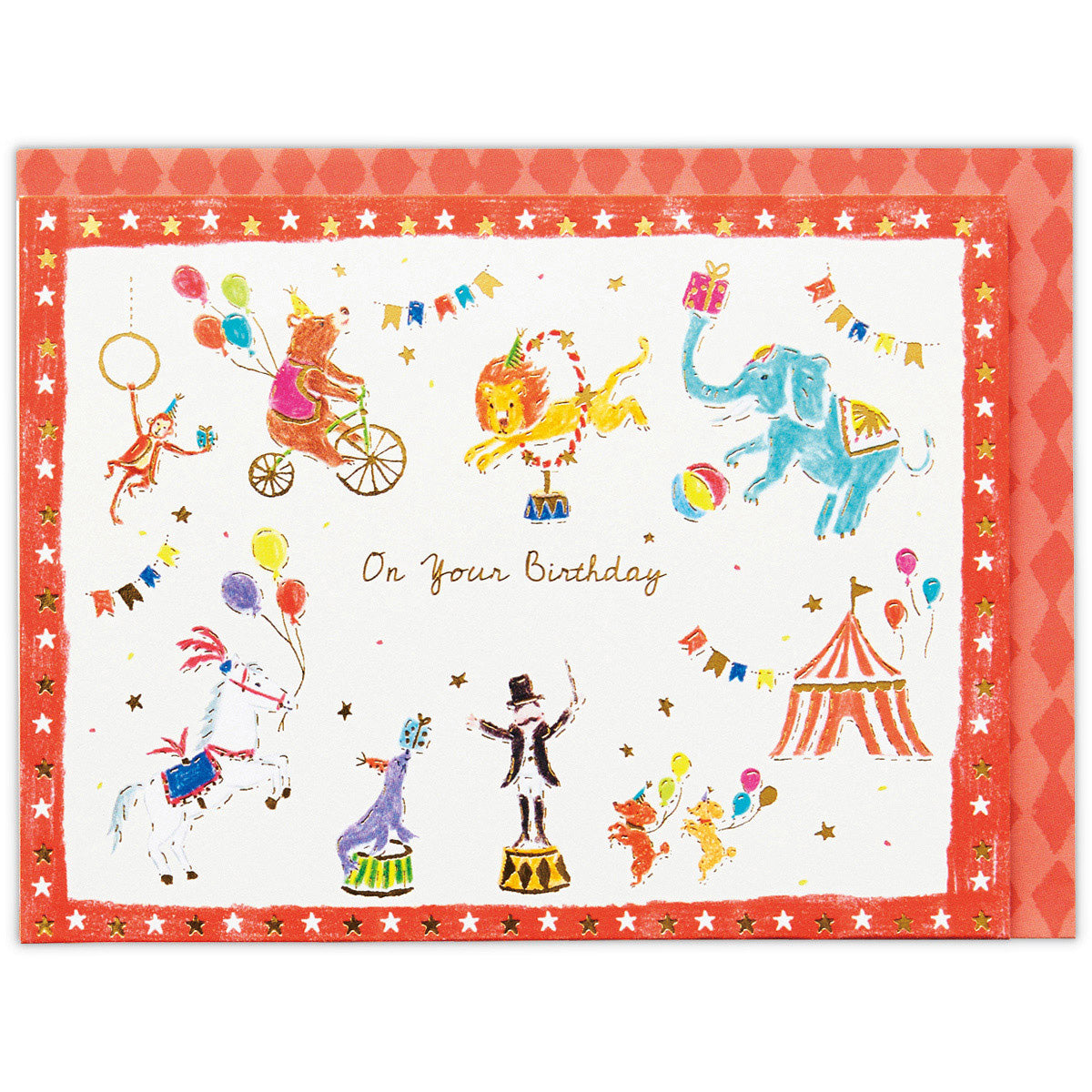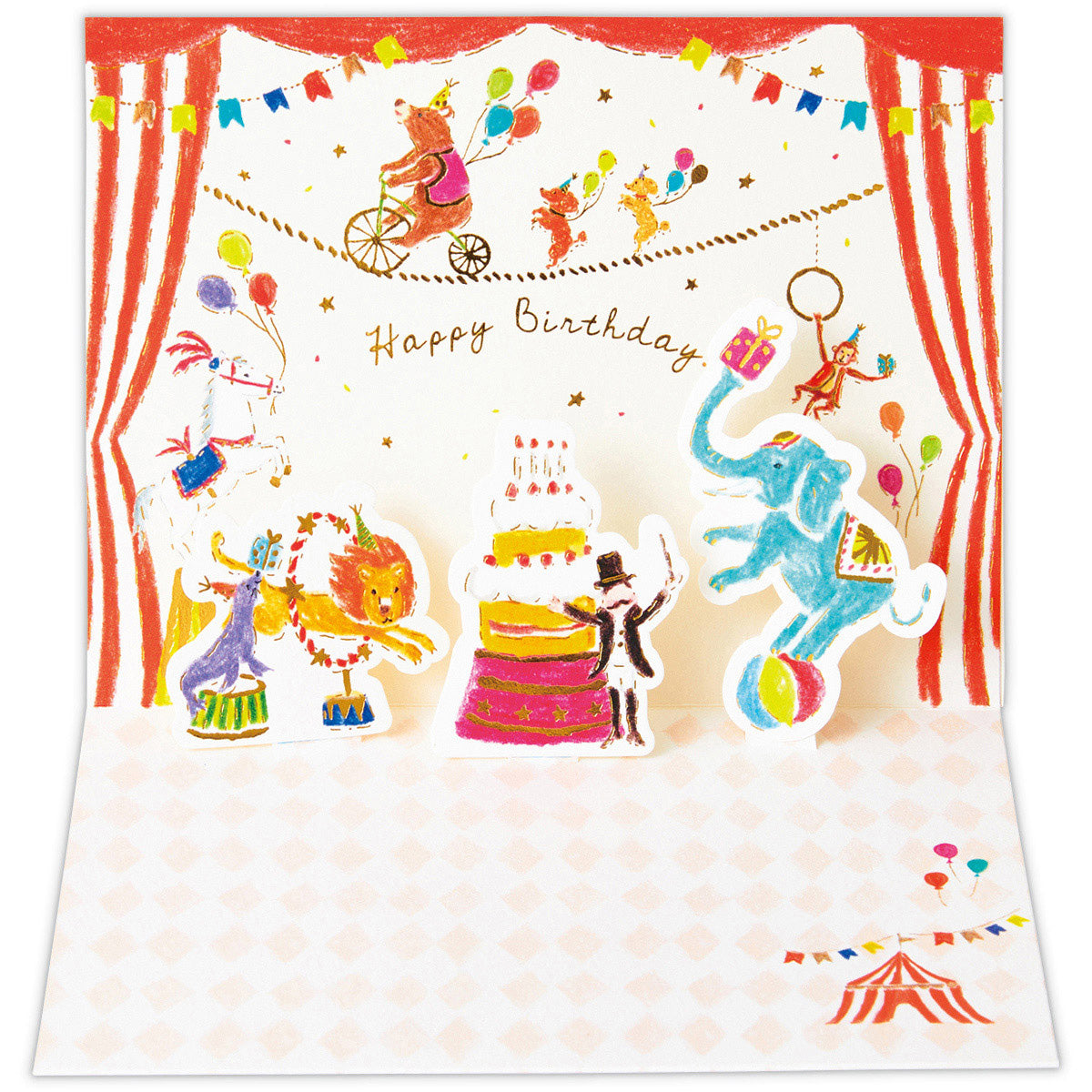 誕生日にスペシャルなサーカスをしている動物たちをテーマにしました。カジュアルなイラストのタッチと、明るい気持ちにさせてくれる華やかな色合いがポイントです。大人にも贈りやすいデザインのカードです。