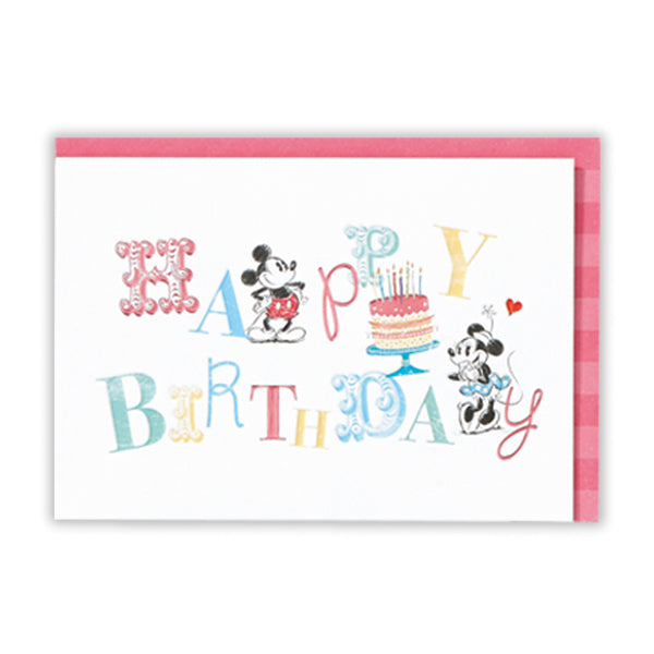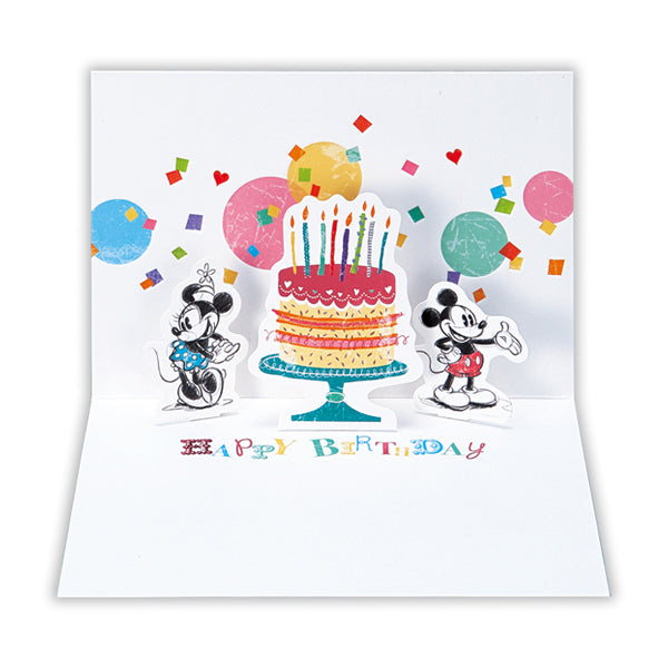 ・ミッキー&ミニーがケーキでお祝いしてくれるカラフルな箔加工を施したおしゃれなデザインの誕生日お祝いカード