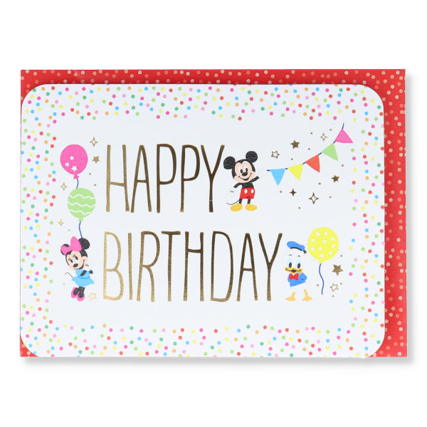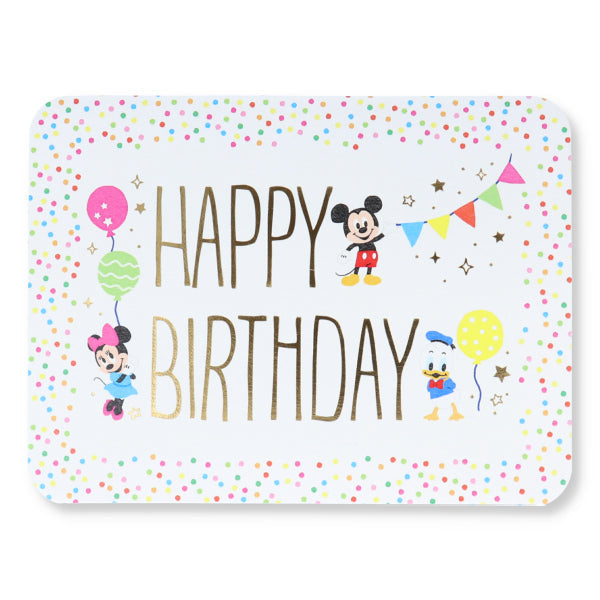・ミッキーと仲間たちがお誕生日を祝ってくれるバースデーカード。プレゼント、風船、ケーキ、ガーランドのイラストがお祝いの気持ちを盛り上げます。