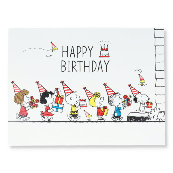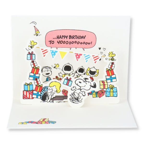 ・スヌーピーと仲間たちがお誕生日を祝ってくれるバースデーカード。プレゼントやガーランドのイラストがお祝いの気持ちを盛り上げます。