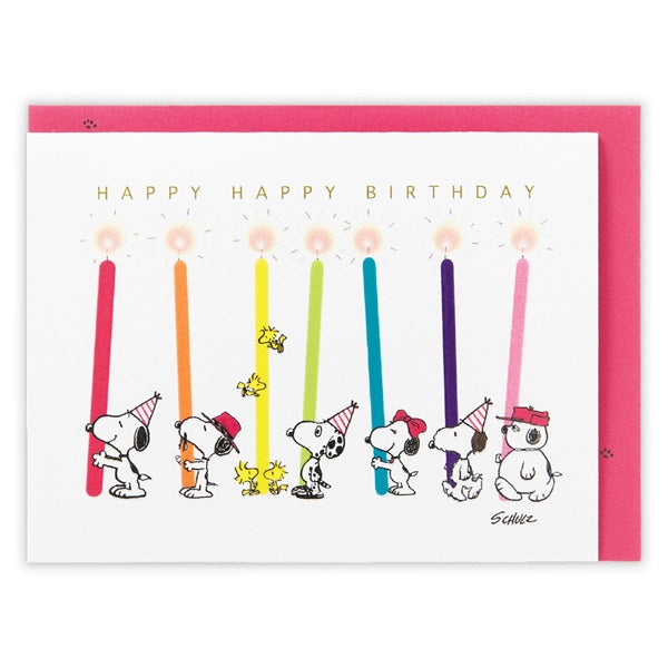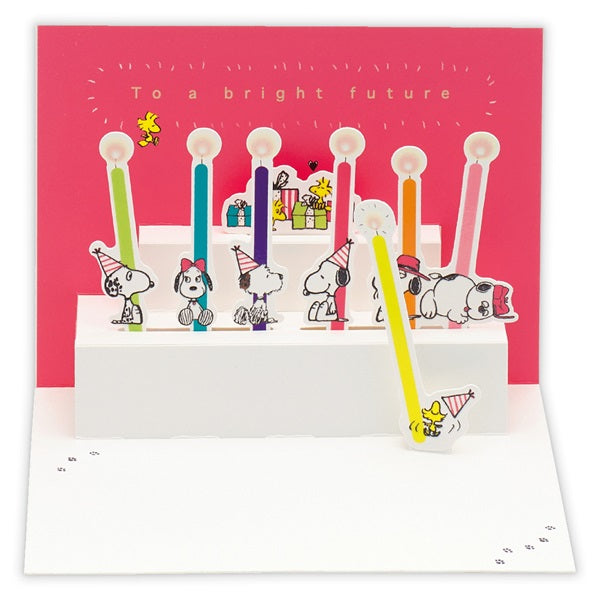 カードを開くと、キャンドルを持ったスヌーピーたちとバースデーケーキが現れるポップアップカード。色とりどりのキャンドルとユニークな兄弟たちの姿が、特別な誕生日を楽しく演出してくれます。