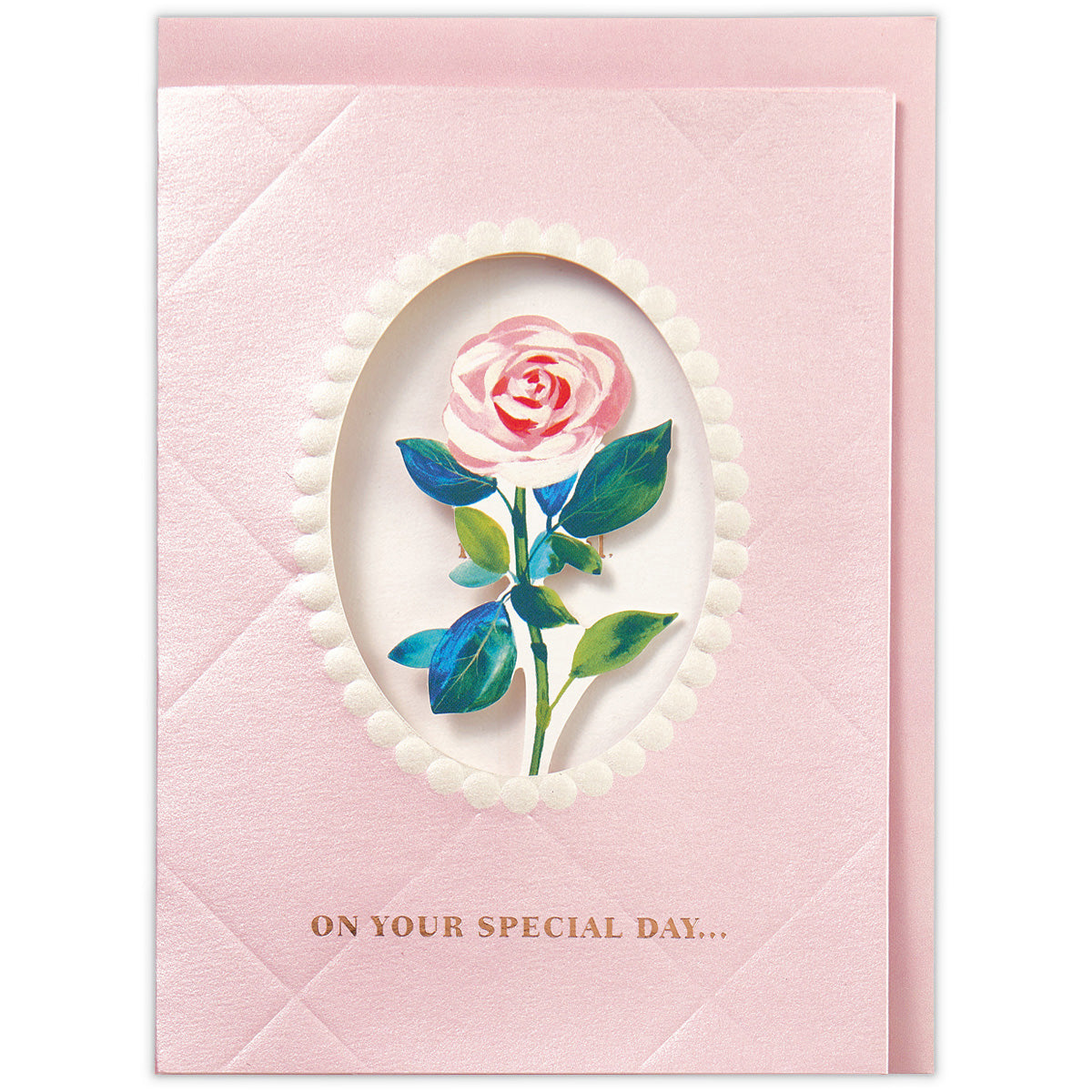 カードを開くと一輪の花が浮かび上がる立体カードです。光沢のあるパール加工とエンボス加工でキルティング風の質感を表現した、エレガントで高級感あるデザインです。