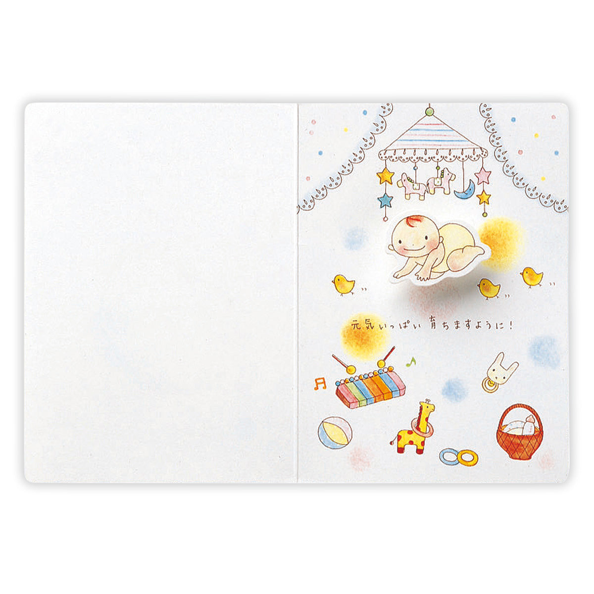 新しい家族のお祝いに贈る出産祝いカードです。可愛らしい絵柄で友人や家族のお祝いにぴったり!カードを開くと赤ちゃんがポップアップで飛び出します。