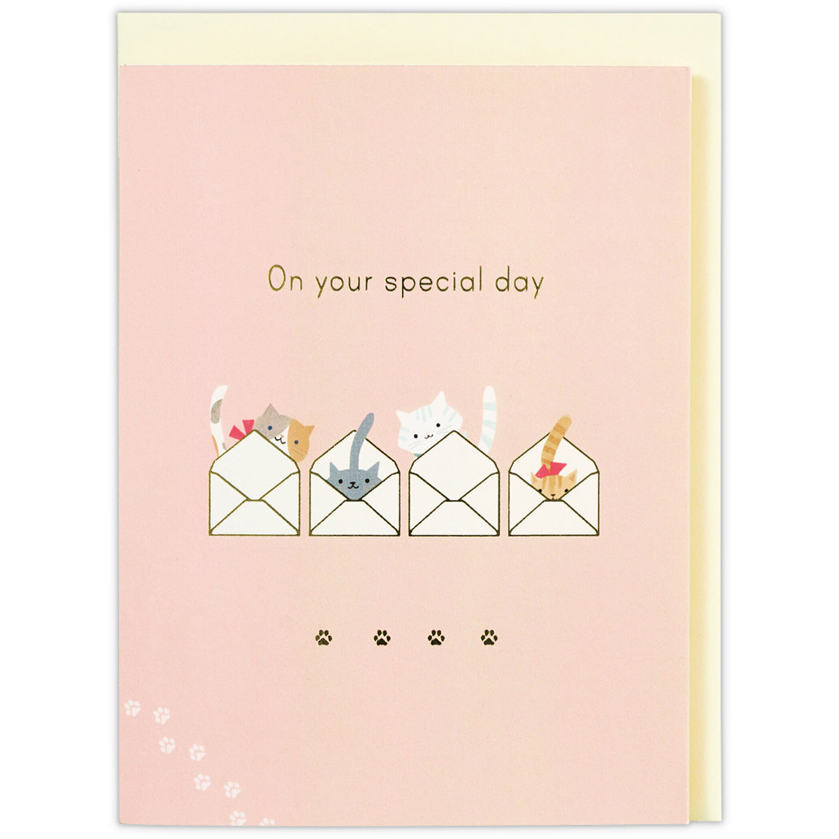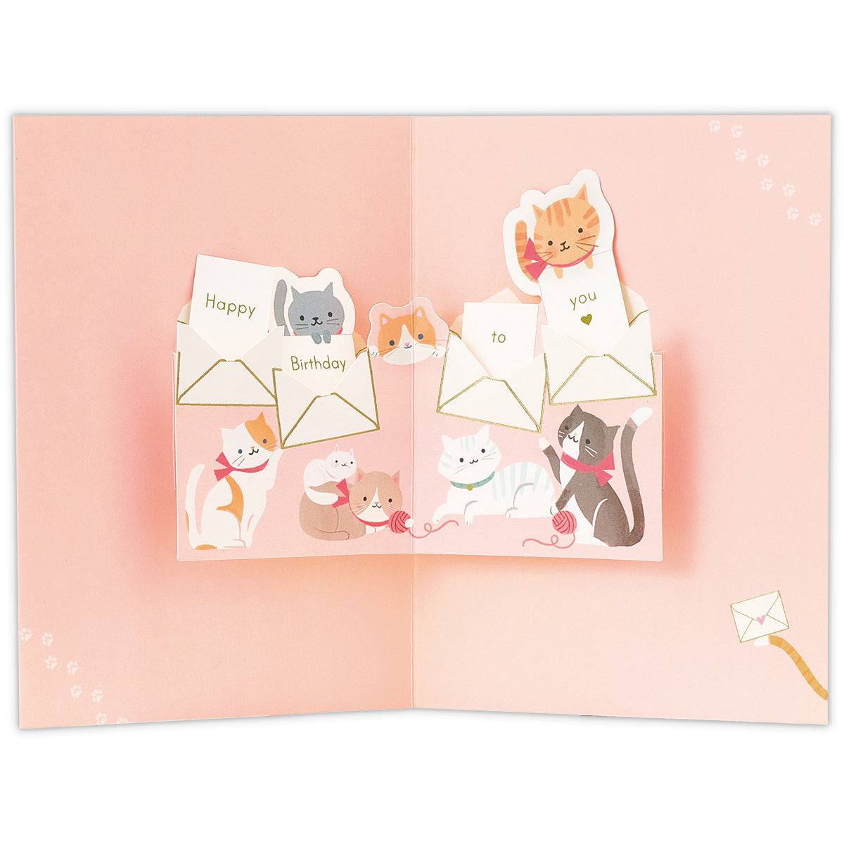 小さい動物たちがメッセージを届けてくれる「Message from small animals」シリーズ。封筒から飛び出すメッセージとひょっこり顔を出す猫たちが可愛らしいバースデーカードです。
