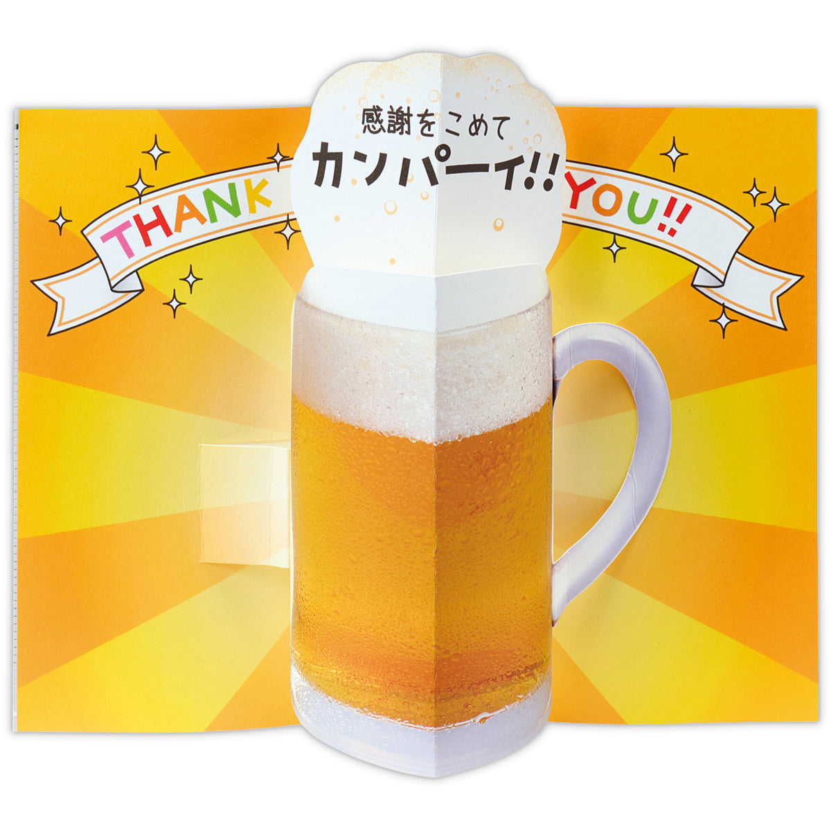 ビールのパッケージを模したユニークなサンキューカードです。カードを開くと泡がたっぷりのビールジョッキがポップアップします。