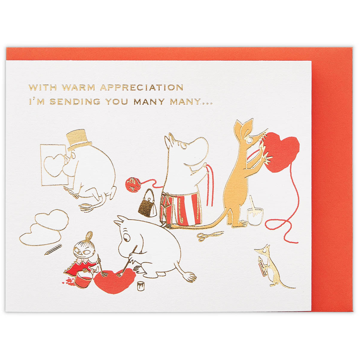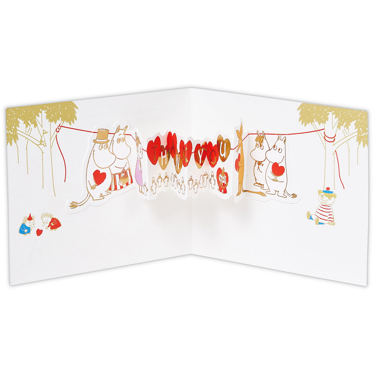 ちょっとしたメッセージを書いたりギフトに添えたりしやすい立体ミニカード。ハートに描かれた「THANK YOU」の文字が際立つ、ムーミンと仲間たちのラブリーなミニカードです。