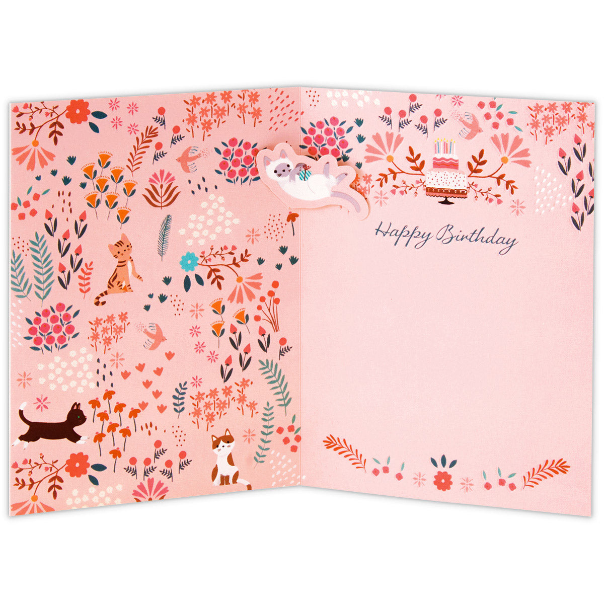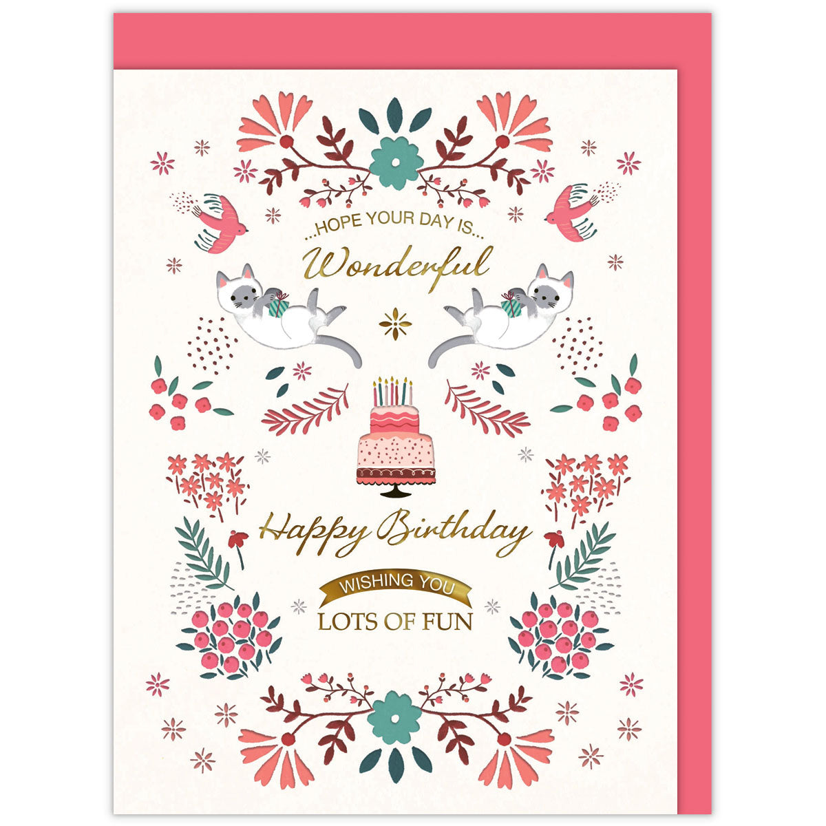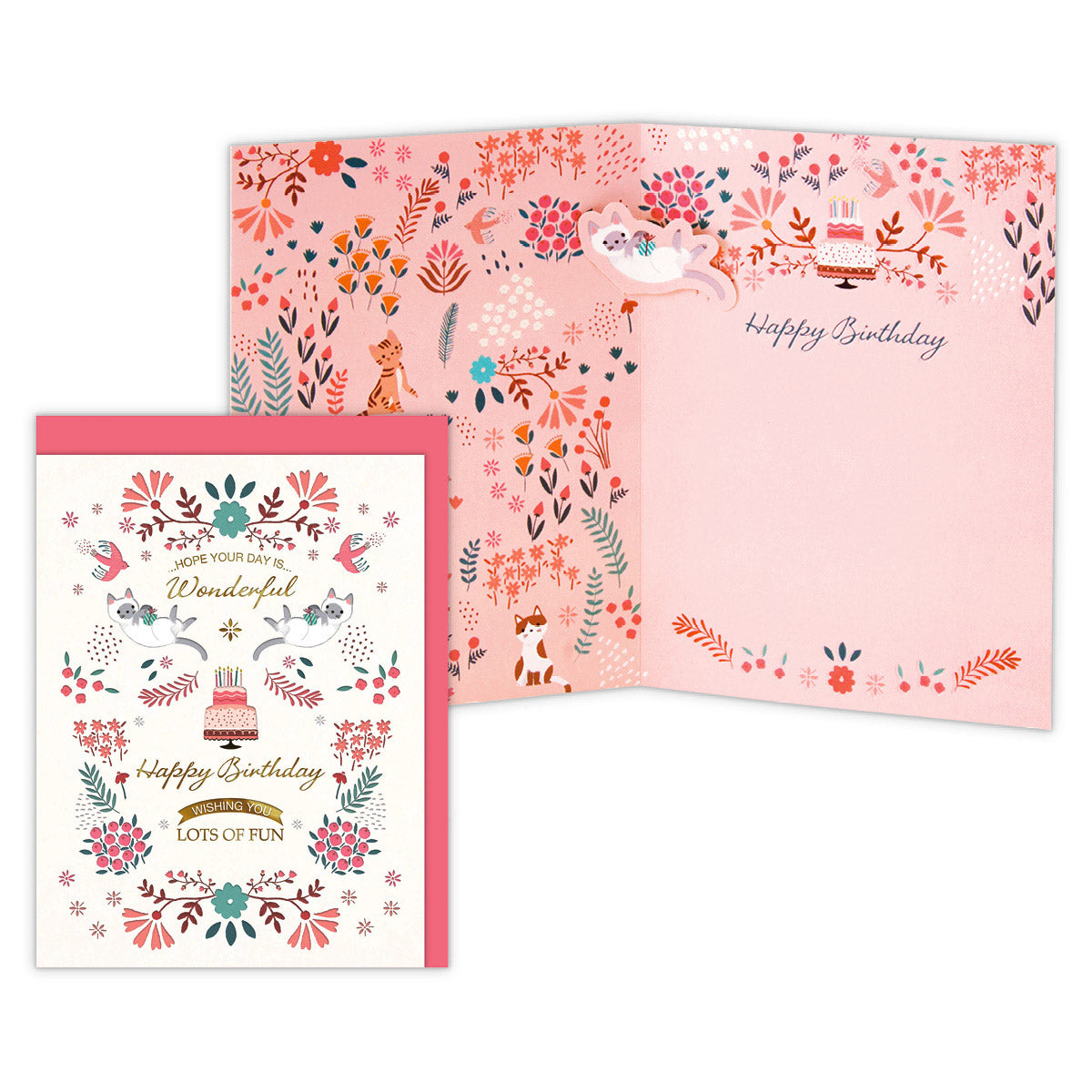 猫、花、小鳥のモチーフをピンク基調のやわらかい色合いで描きました。カードを開くと猫がさりげなくポップアップ。ぽこっと凹むデボス加工がアクセントです。表:HOPE YOUR DAY IS Wonderful Happy Birthday WISHING YOU LOTS OF FUN