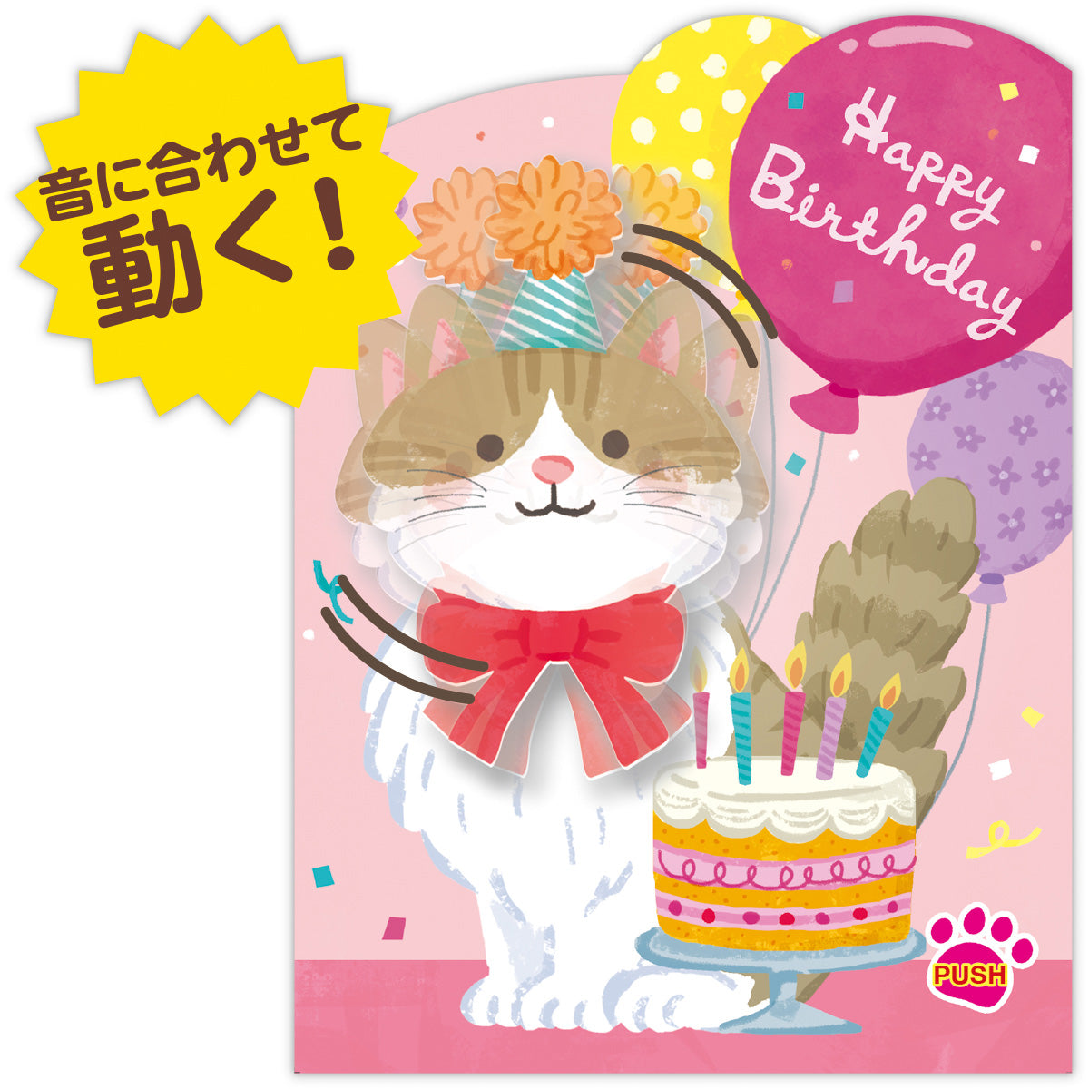 音楽に合わせて動くオルゴールカードが登場! バースデーソングに合わせて猫がご機嫌に首を振って誕生日をお祝いします。猫の鳴き声入り。