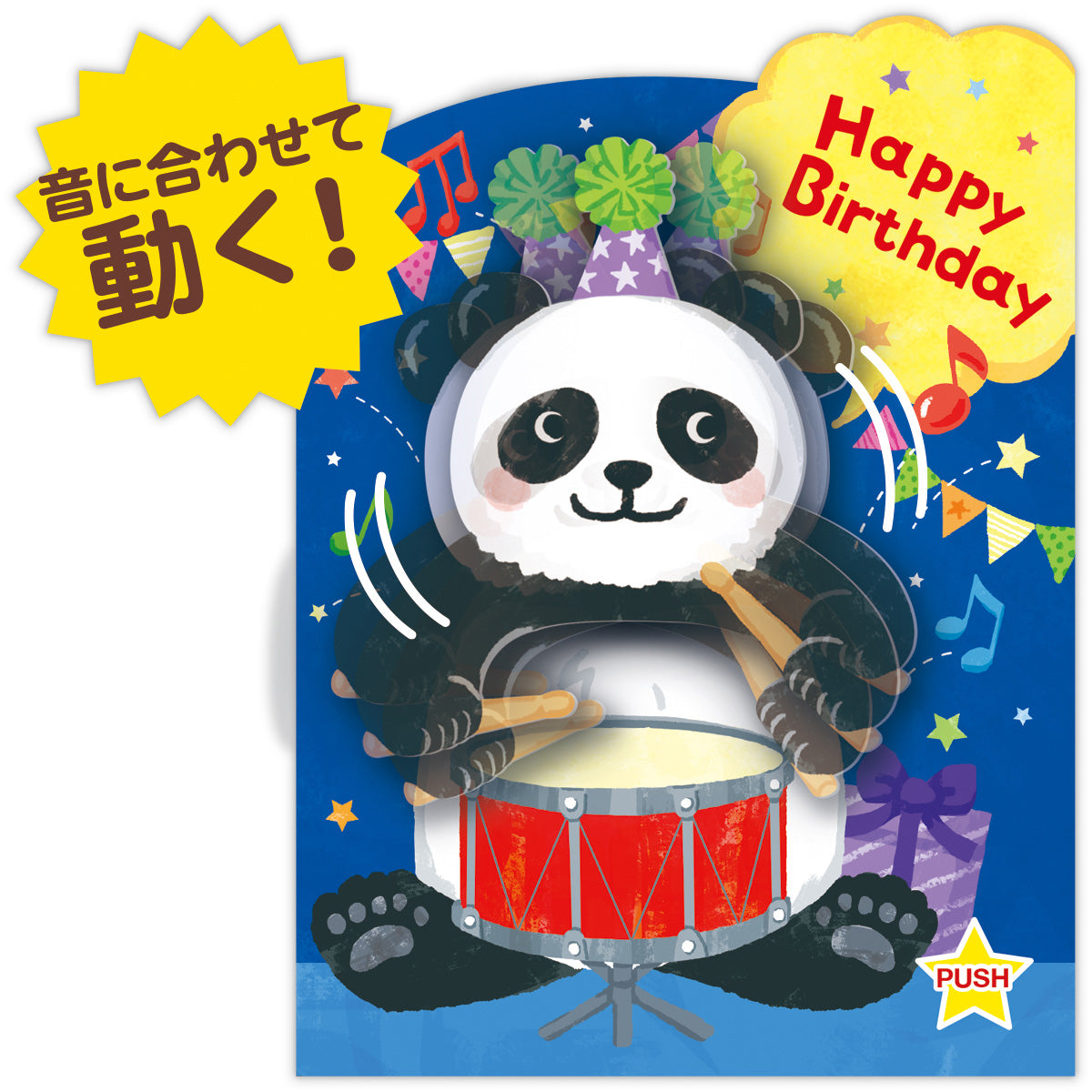 音楽に合わせて動くオルゴールカードが登場! パンダがリズミカルに太鼓を叩いて誕生日をお祝いしてくれます。