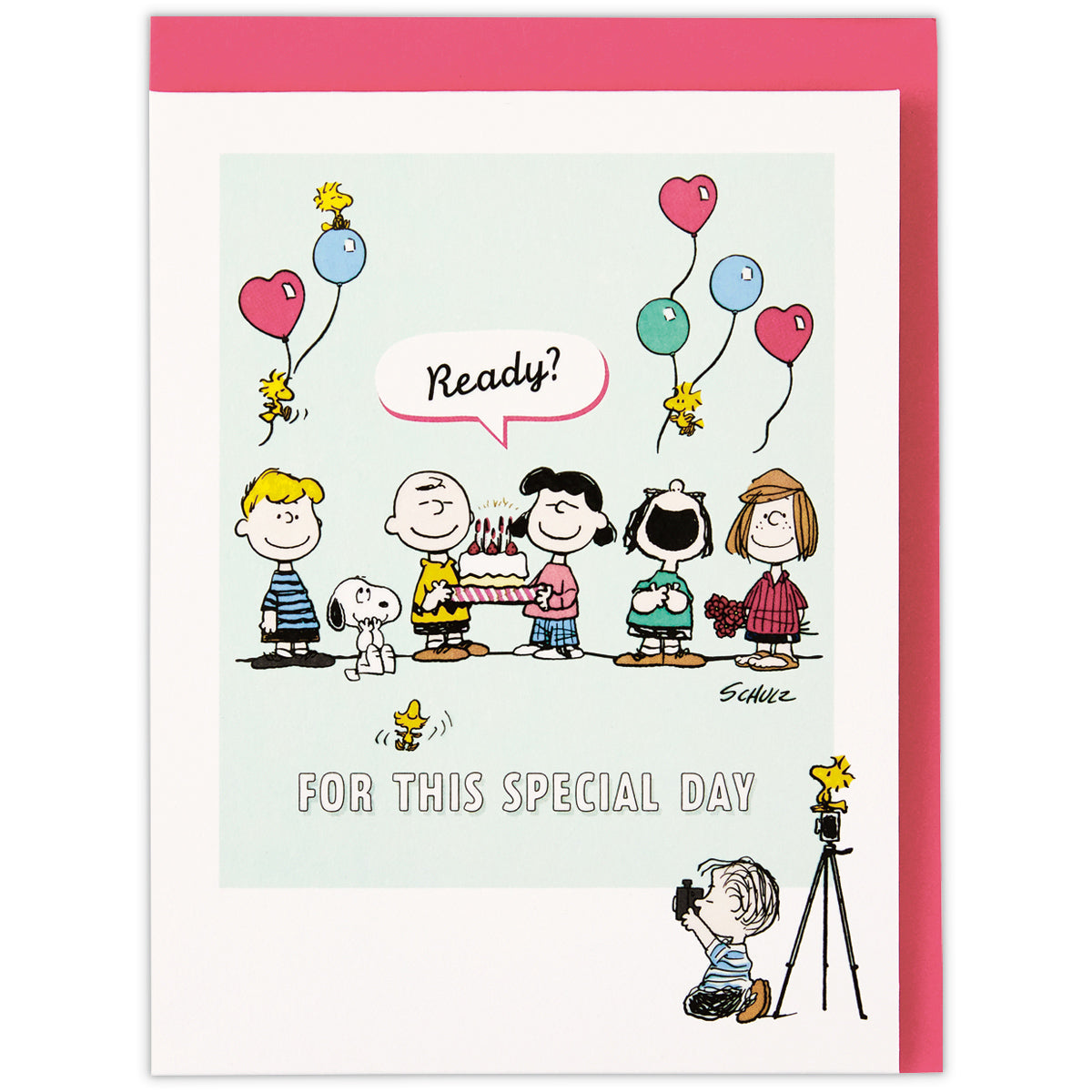カードを開くとスヌーピーと仲間たちのにぎやかな写真撮影のシーンがポップアップ。表紙はインスタント写真をイメージした白フレーム入りです。