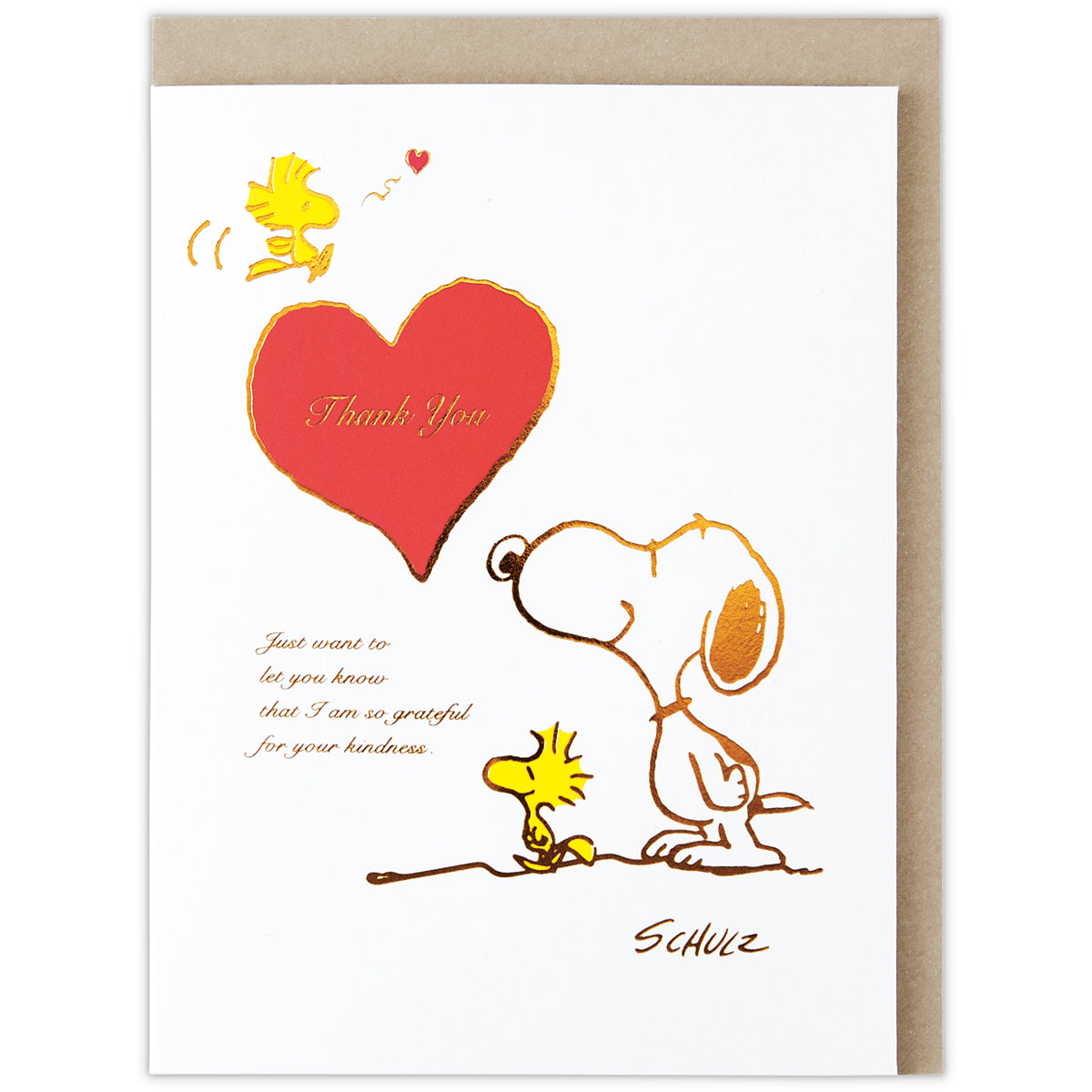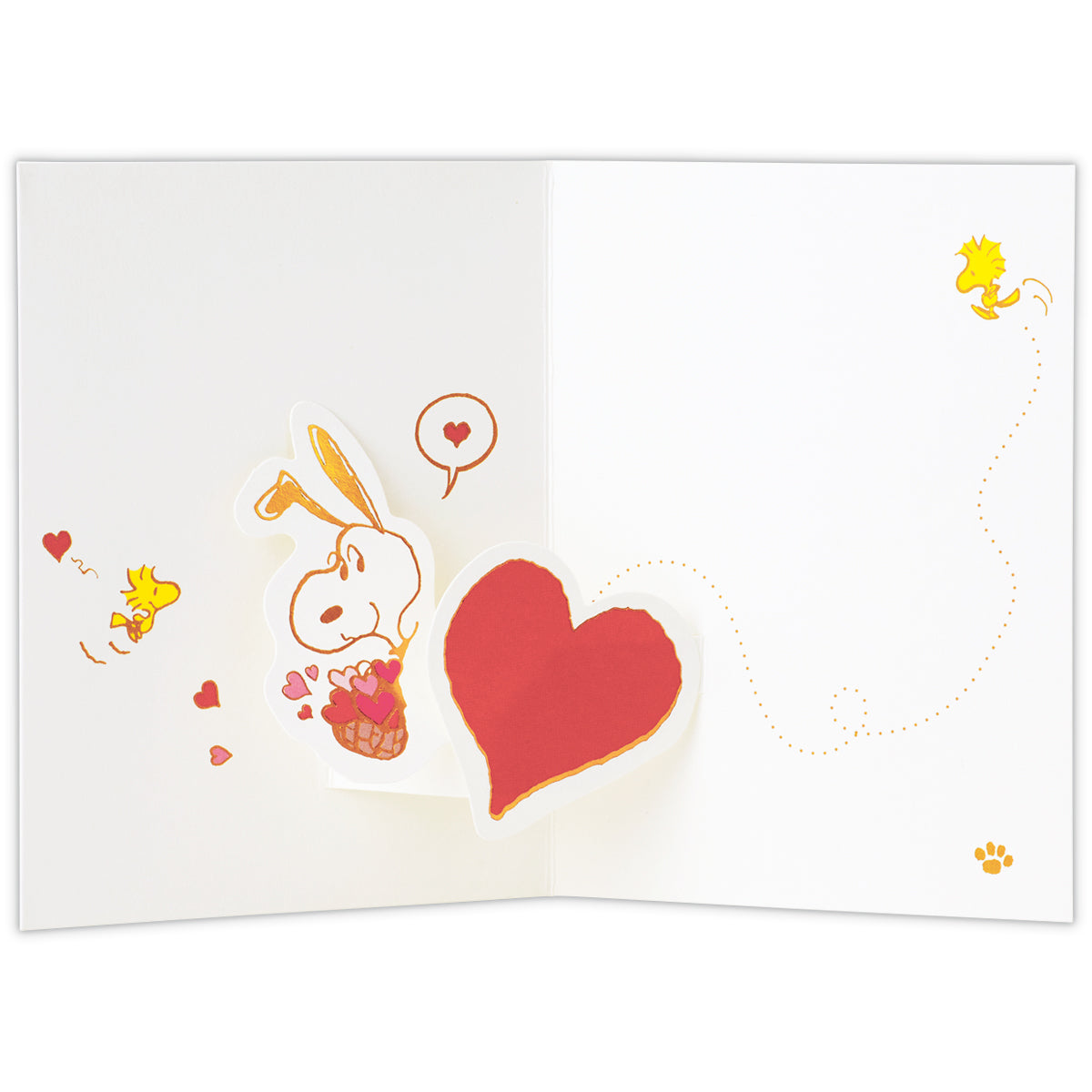 大きなハートが印象的なサンキューカード。カードを開くとスヌーピーがハートからひょっこり顔を出す可愛らしいデザインです。