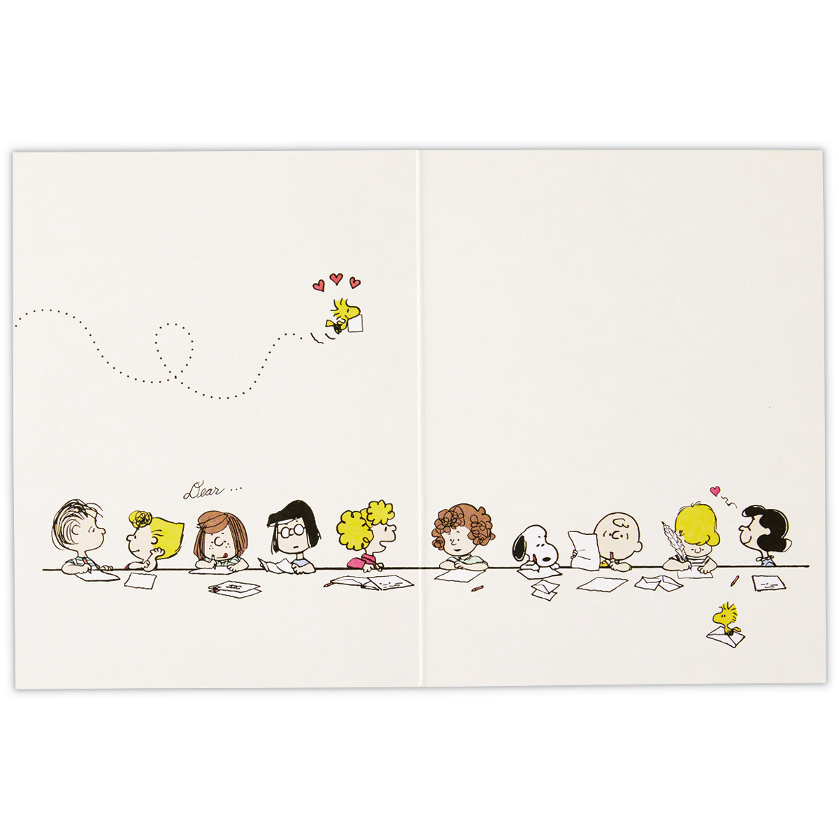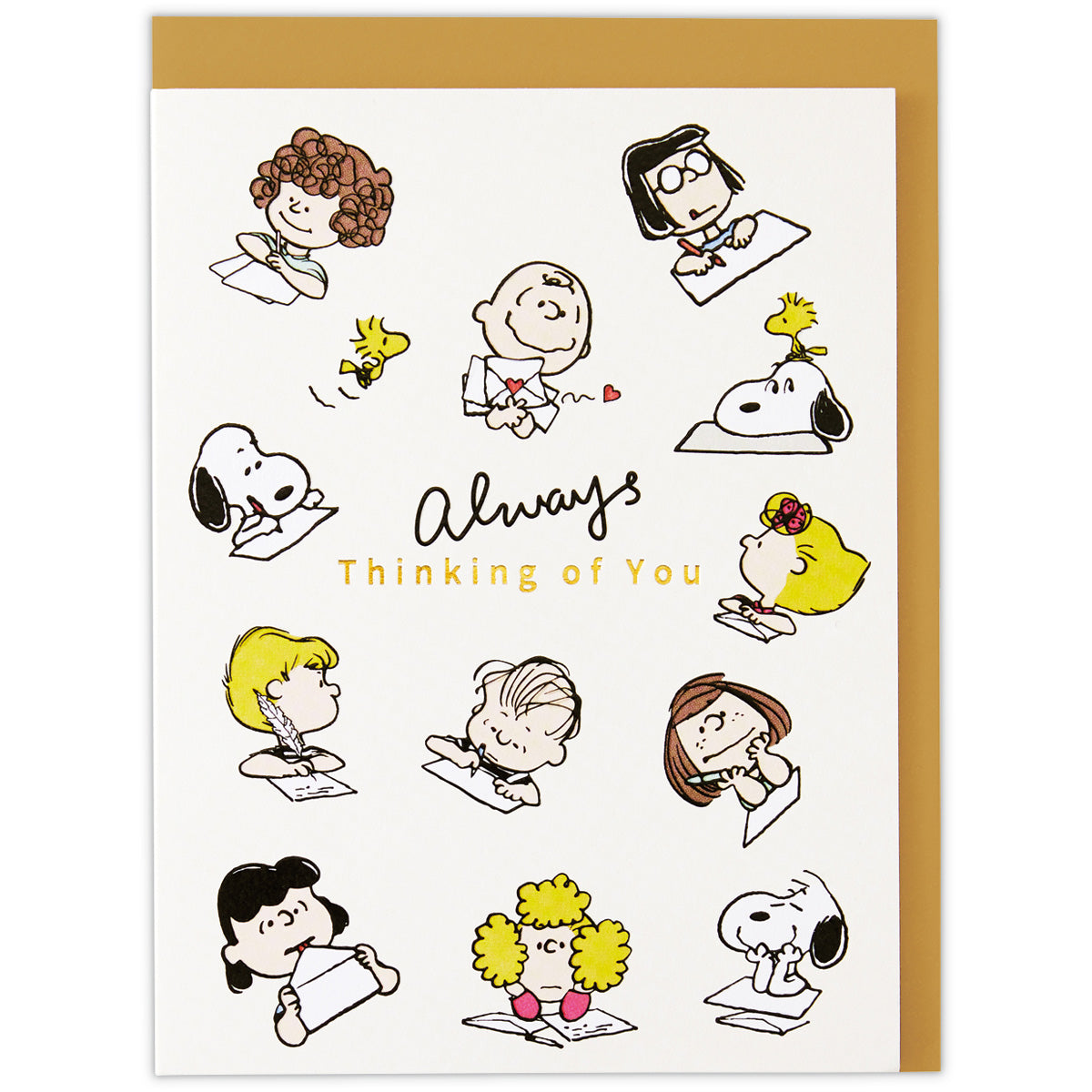 お手紙をしたためるスヌーピーと仲間たちの可愛らしい多目的カード。落ち着いた色合いなので大人にも贈りやすいデザインです。