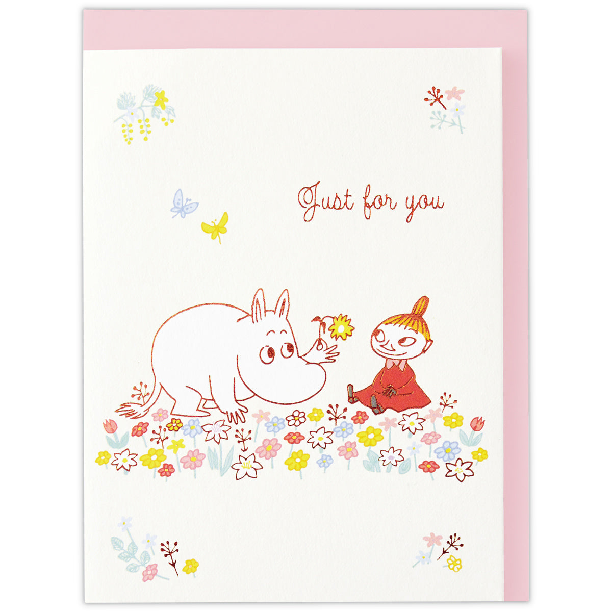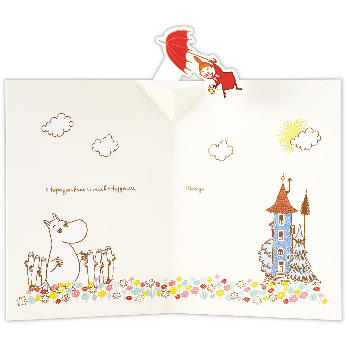 花畑にちょこんと座るムーミンとリトルミイが可愛らしい多目的カード。カードを開くと傘につかまったリトルミイがふわっと飛んでいきます。