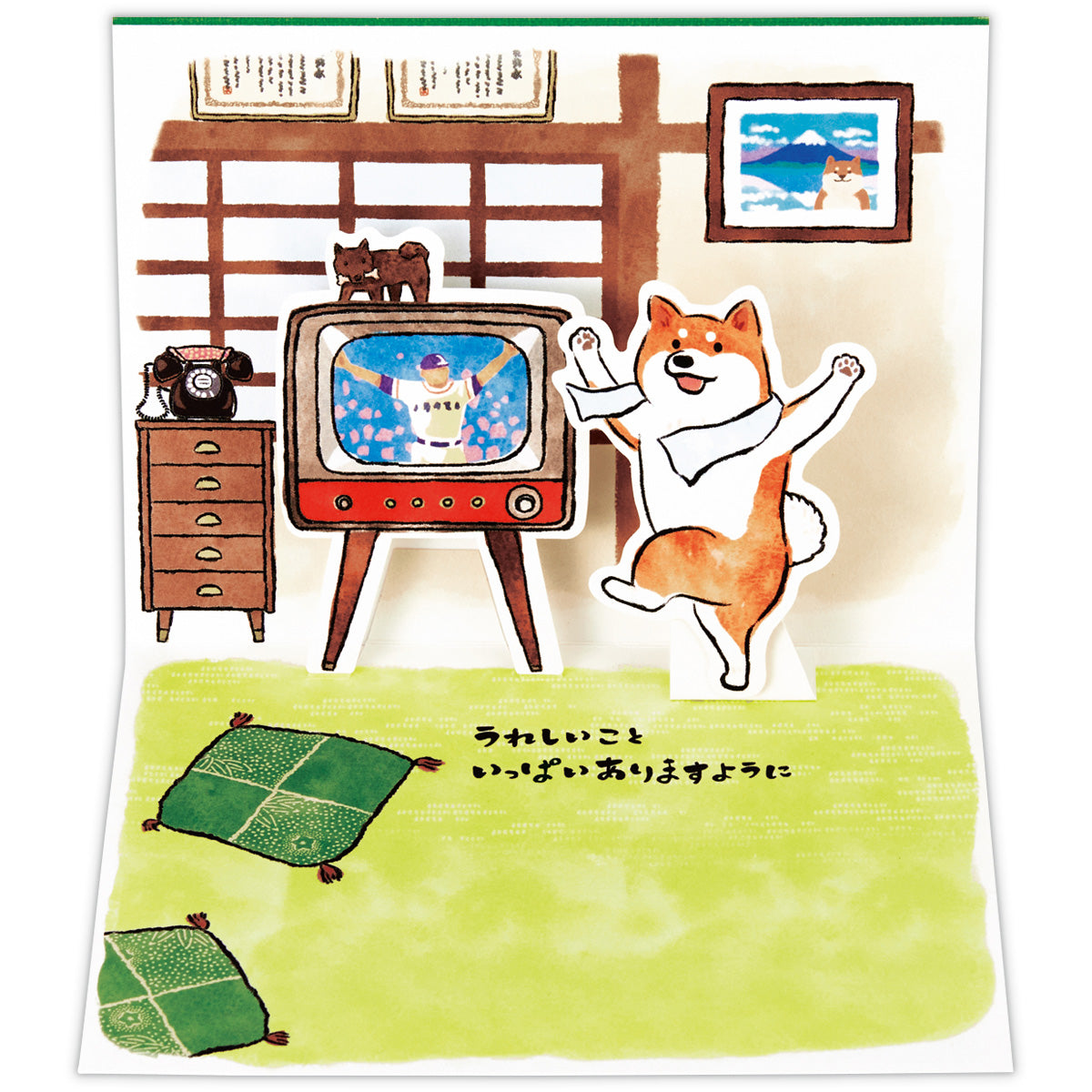 昭和のお父さんをイメージした人気の柴おとんシリーズに新柄が登場! 大好きな野球チームが優勝して喜ぶ可愛らしい柴おとんのデザインです。