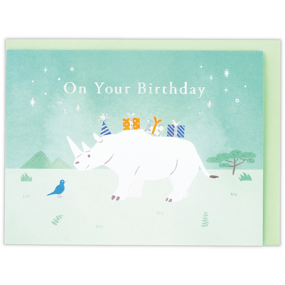 白い動物をテーマに、お誕生日の場面を可愛らしく描きました。男性にも贈りやすいよう爽やかなブルーやミントカラーをチョイスしました。