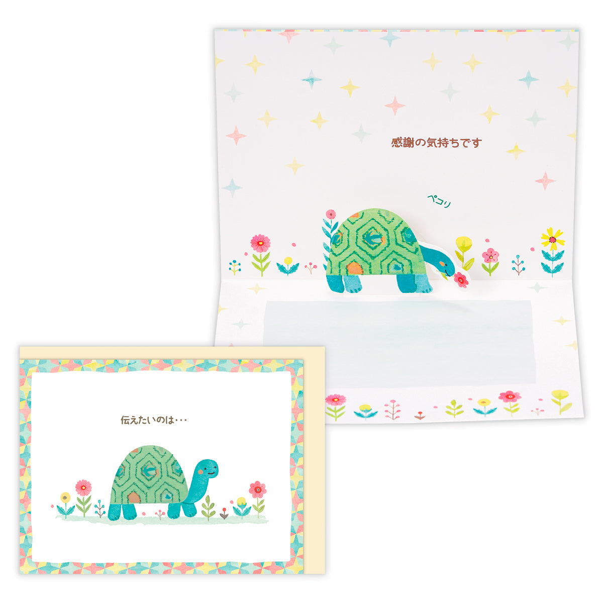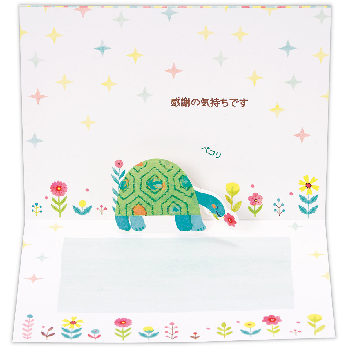 キャプションに合わせたアートと立体が魅力のサンキューカードが登場! カードを開くとかめがペコリとお辞儀をするキュートな立体仕様。ほんわかした雰囲気に心がほっと安らぐデザインです。