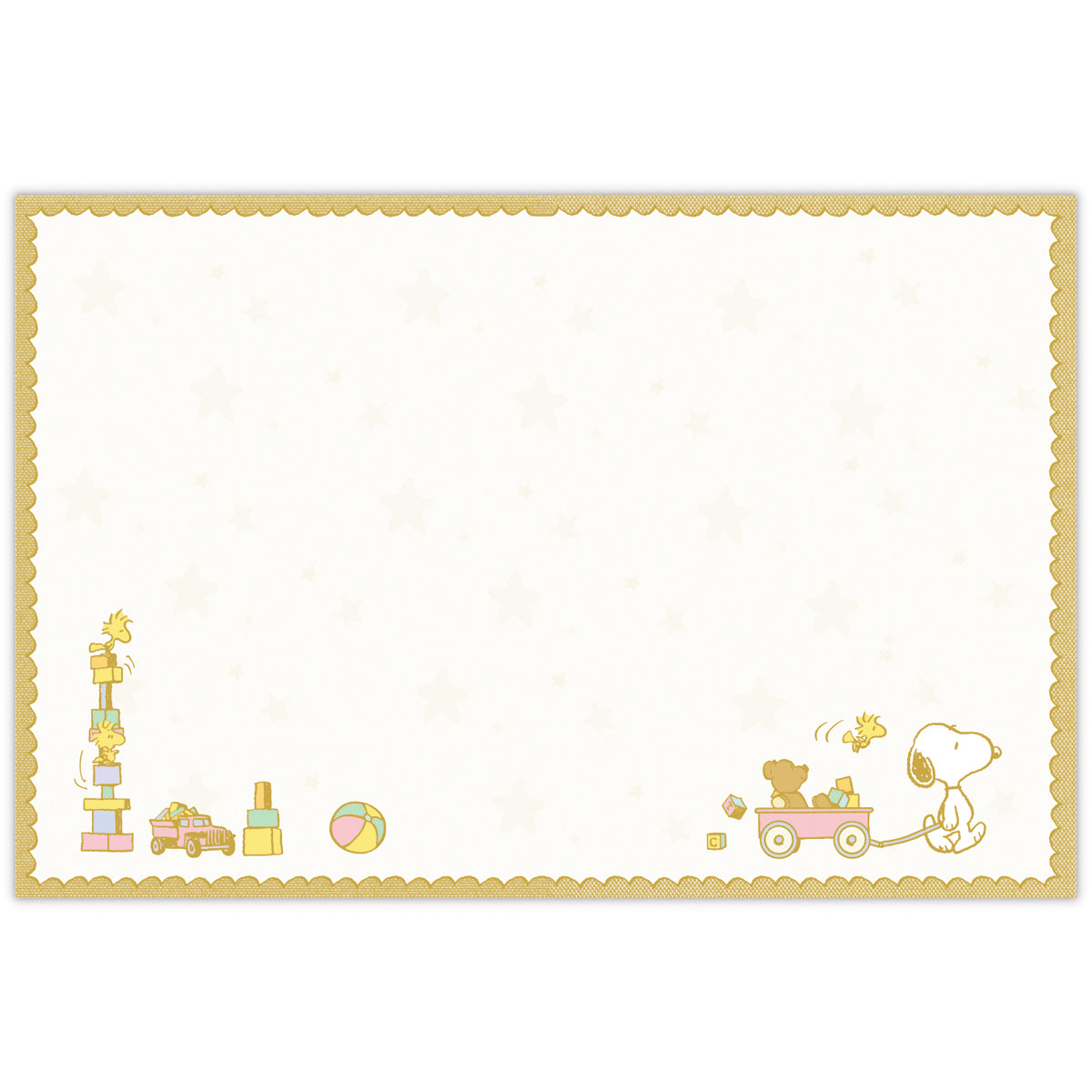メリーをテーマにした、スヌーピーときょうだいたちの赤ちゃん誕生お祝いカードが登場。書き面が広いため、寄せ書きなどみんなでお祝いするシーンにもぴったりのデザイン。可愛らしいスヌーピーときょうだいたちの姿にあたたかい気持ちになれるカードです。