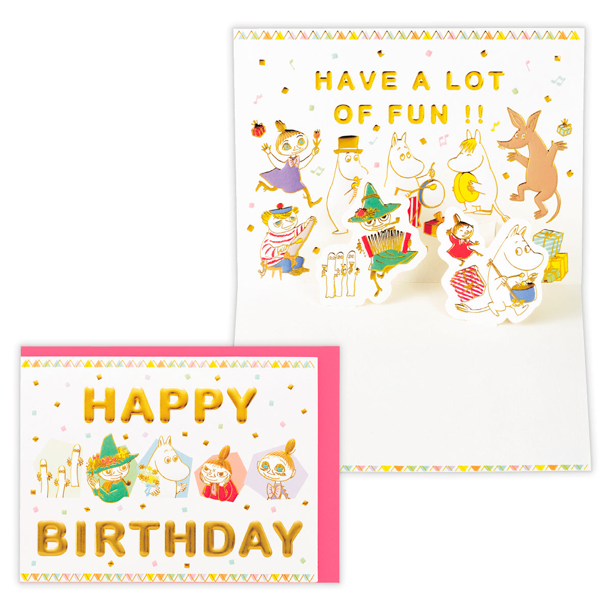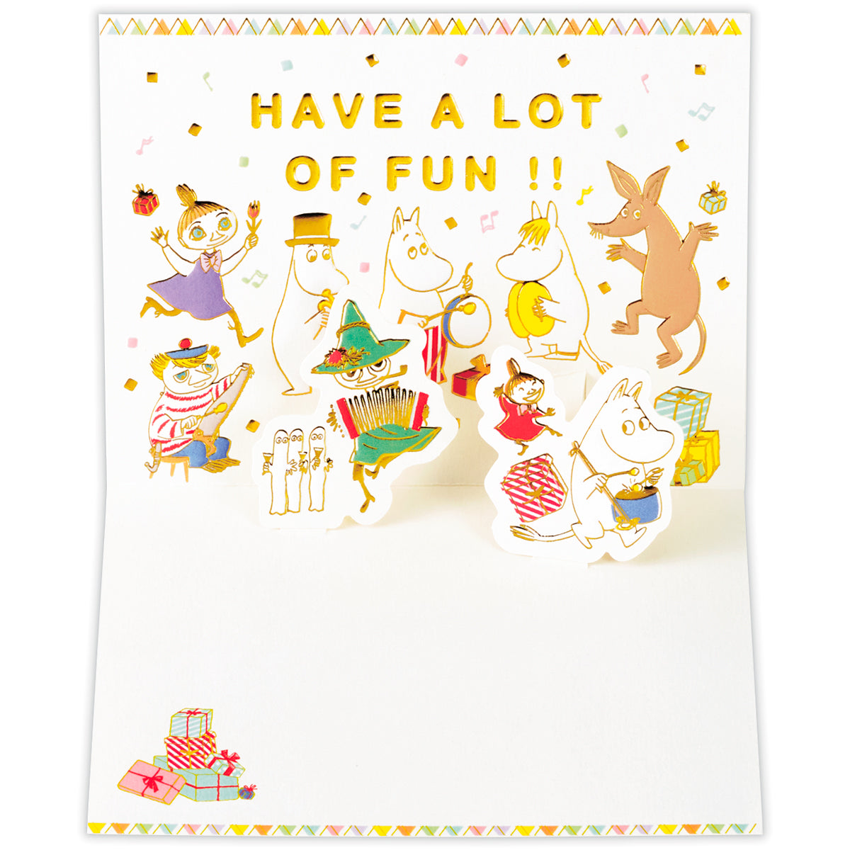 より立体的な3Dエンボスと箔加工を使用して、ムーミンと仲間たちの顔を印象的に表現しました。カードを開くと楽器を演奏するキャラクターがポップアップ!