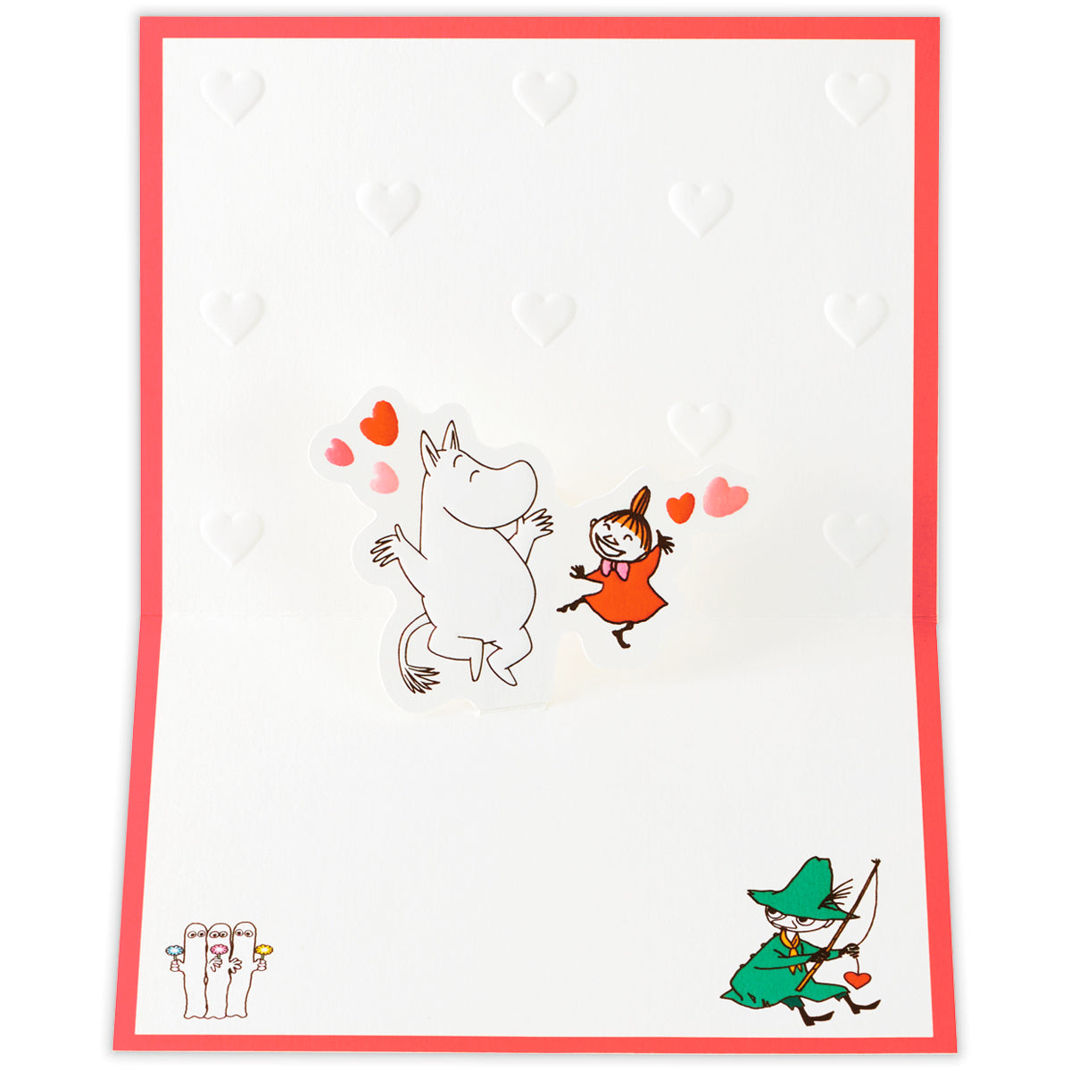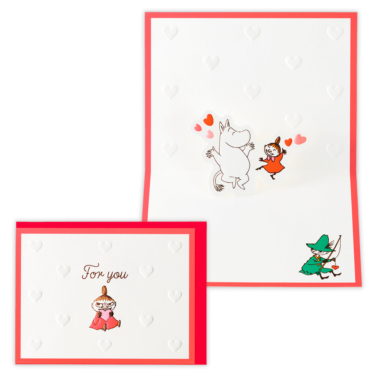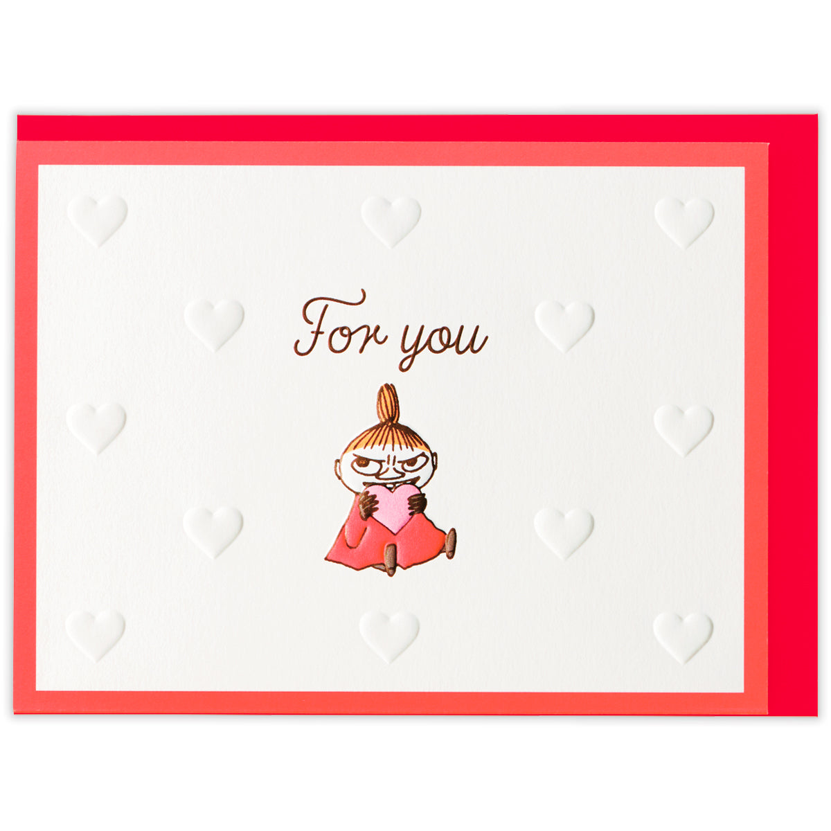 リトルミイの可愛らしいアートと鮮やかな赤が印象的なデザイン。空押しのエンボスで表現した控えめなハートが、上品で大人っぽい印象を添えます。感謝やお祝いのほか、バレンタインなどの季節イベントにもおすすめです。