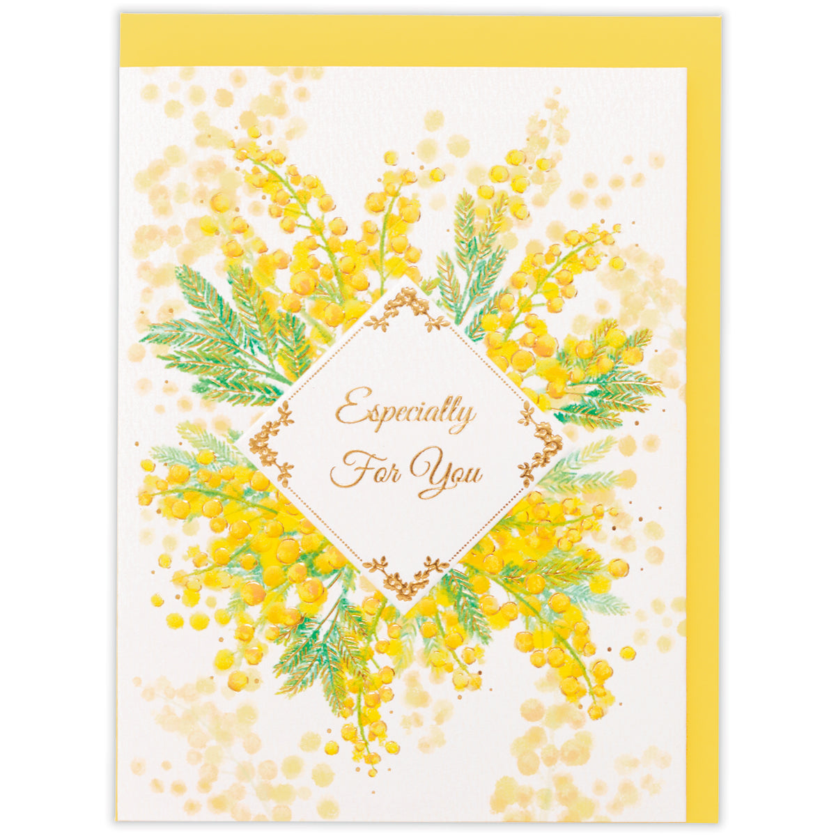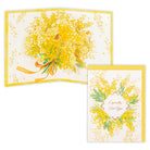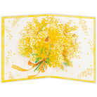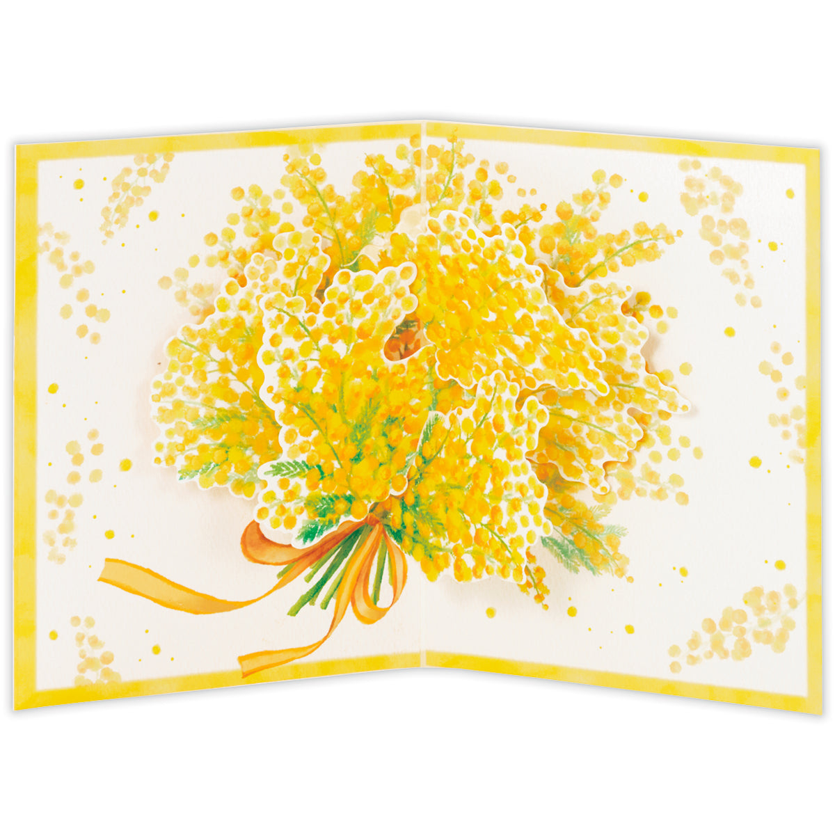 春の花として注目度が高まっている可愛らしいミモザのカード。ボリュームたっぷりに表現されたミモザのブーケが華やかにポップアップします。