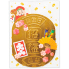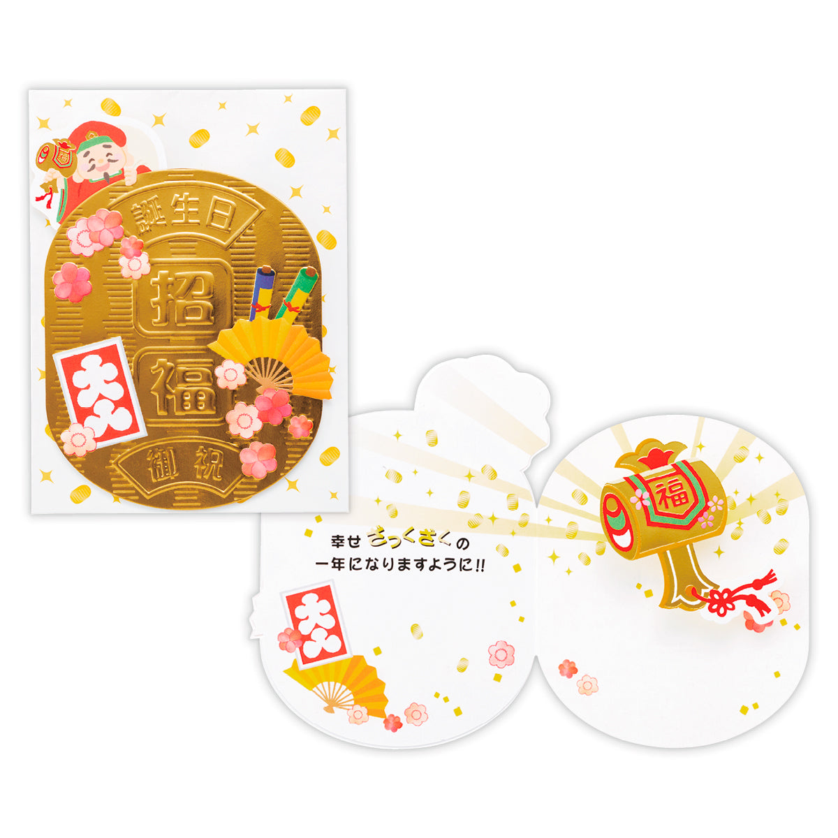 光り輝く小判をテーマにしたおめでたいムード満点のバースデーカード。表紙にはインパクト抜群の金箔をあしらって豪華絢爛に演出しました。ちらりと覗く大黒様と、開くとバネで揺れる打ち出の小づちがポイント!