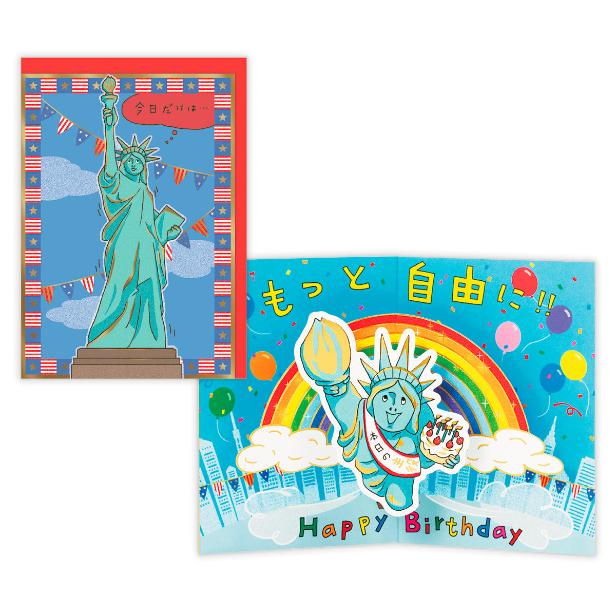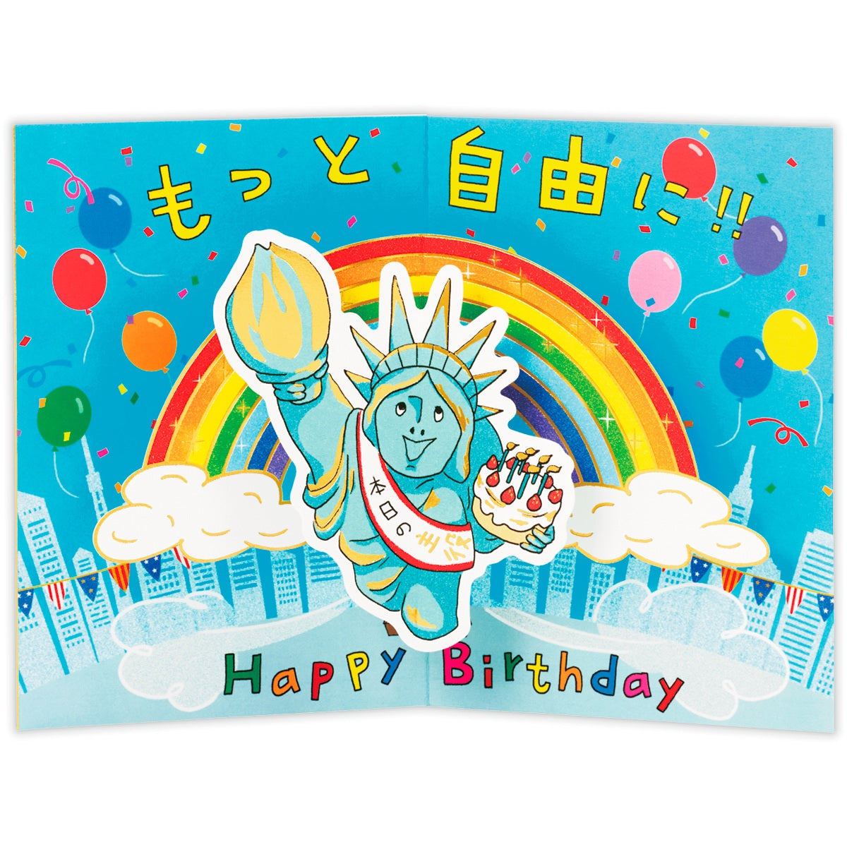 あの像が動く!? 自由の女神が誕生日をお祝いするべく、ビル街から大空へ飛び出すインパクト大のバースデーカードです。