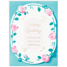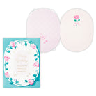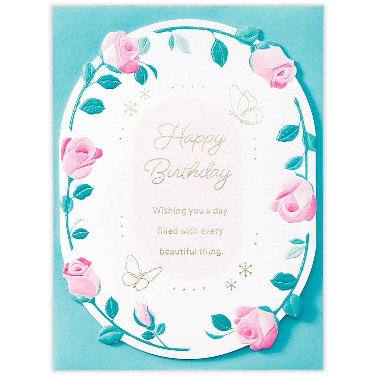 まるでお花のフレームに囲まれたような華やかなデザインのバースデーカード。ダイカットやエンボス、金箔加工を組み合わせて、シンプルながらも特別感のあるデザインに仕上げました。