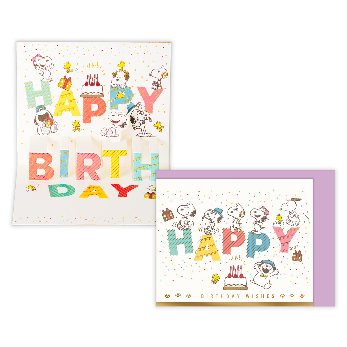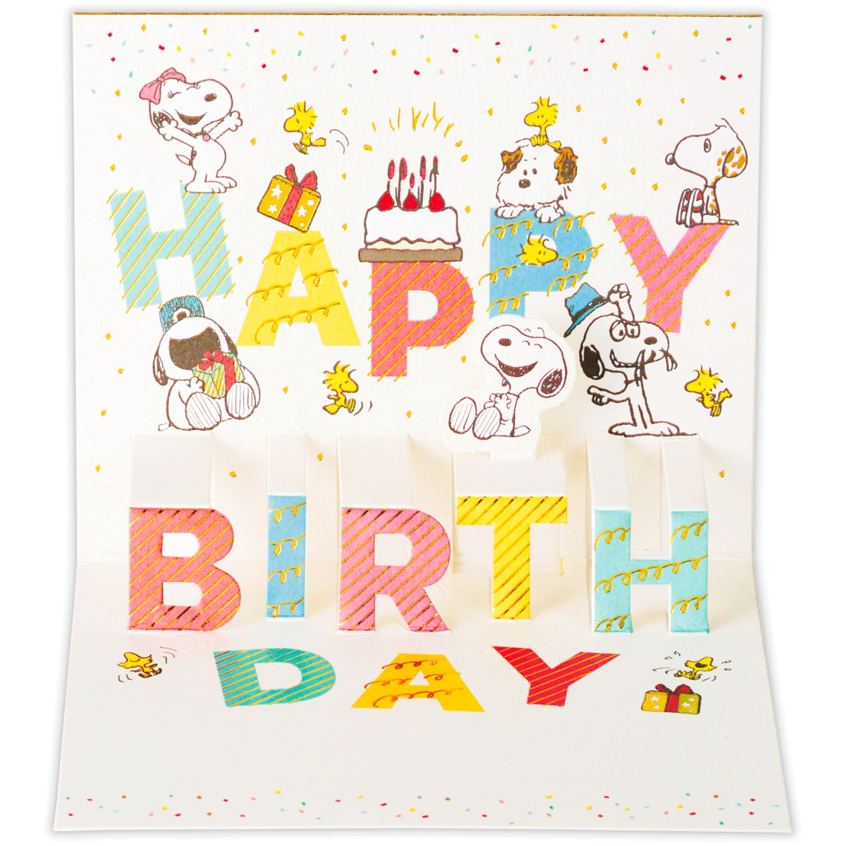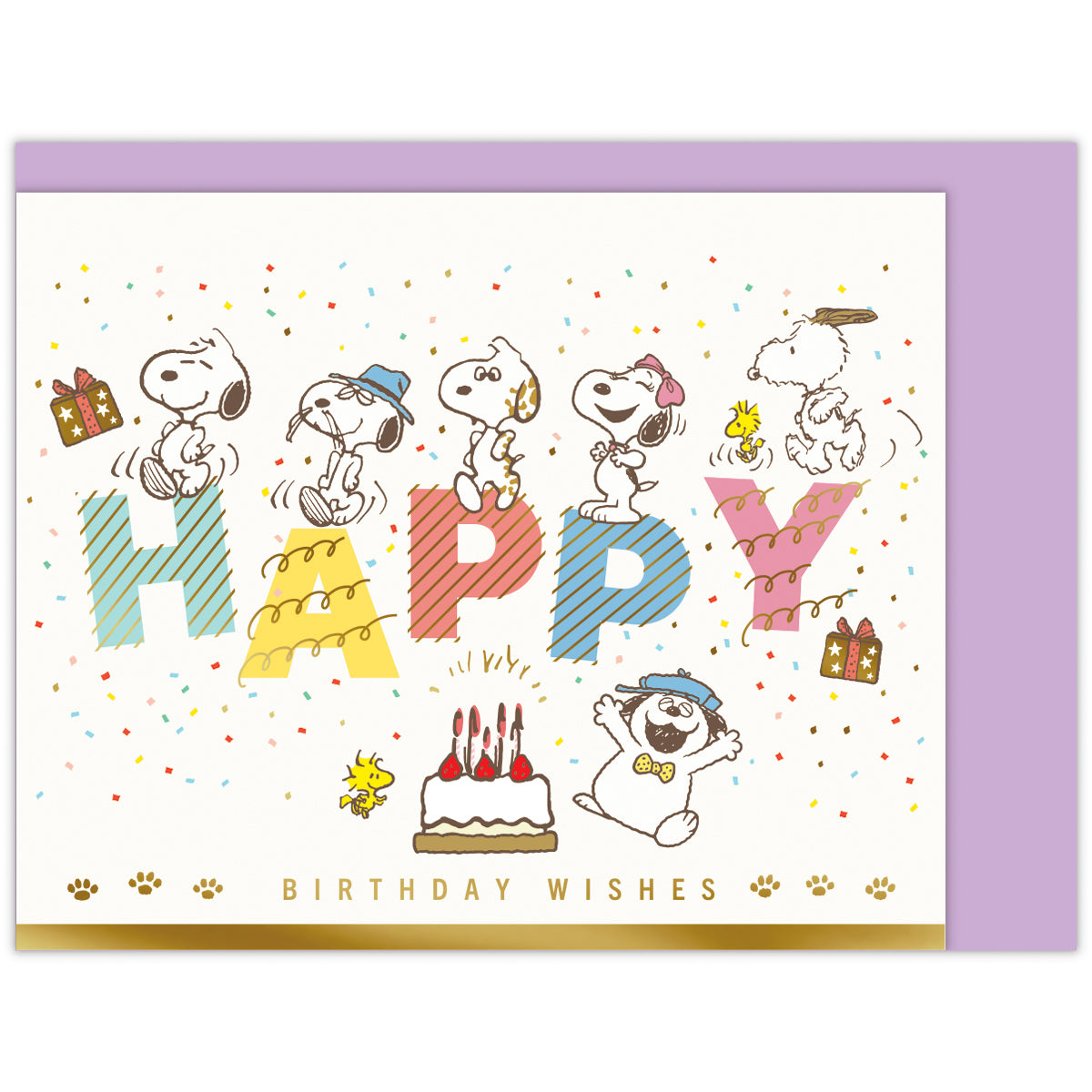 ギフトに添えたりさりげなくメッセージを贈ったり…そんなシーンにぴったりのミニカード。大胆にレイアウトされた「HAPPY BIRTHDAY」の文字と、楽しげなスヌーピーときょうだいたちが描かれたカラフルでにぎやかなデザインです。表:HAPPY/BIRTHDAY WISHES