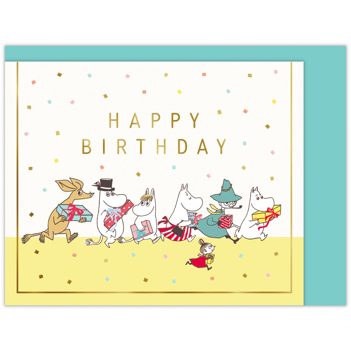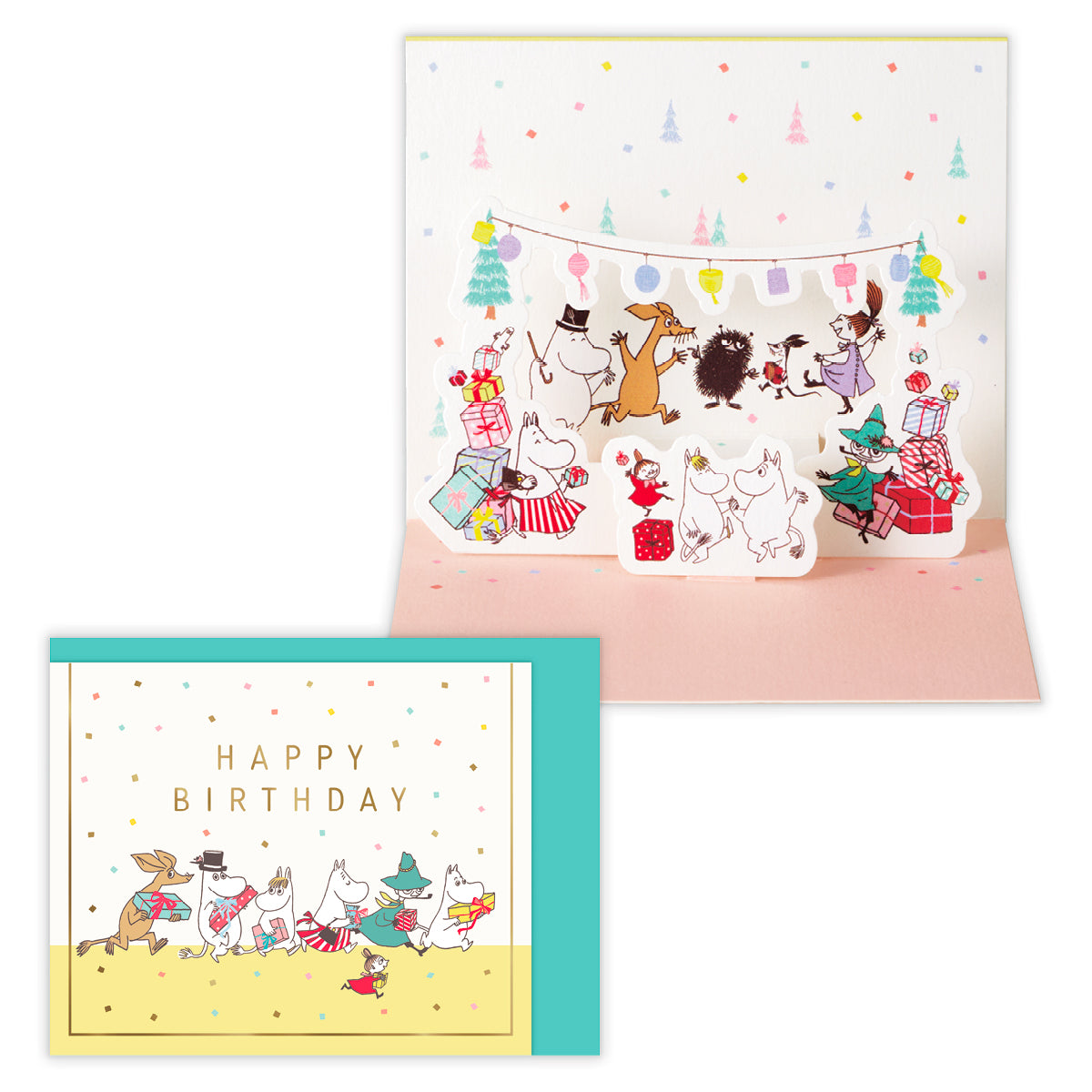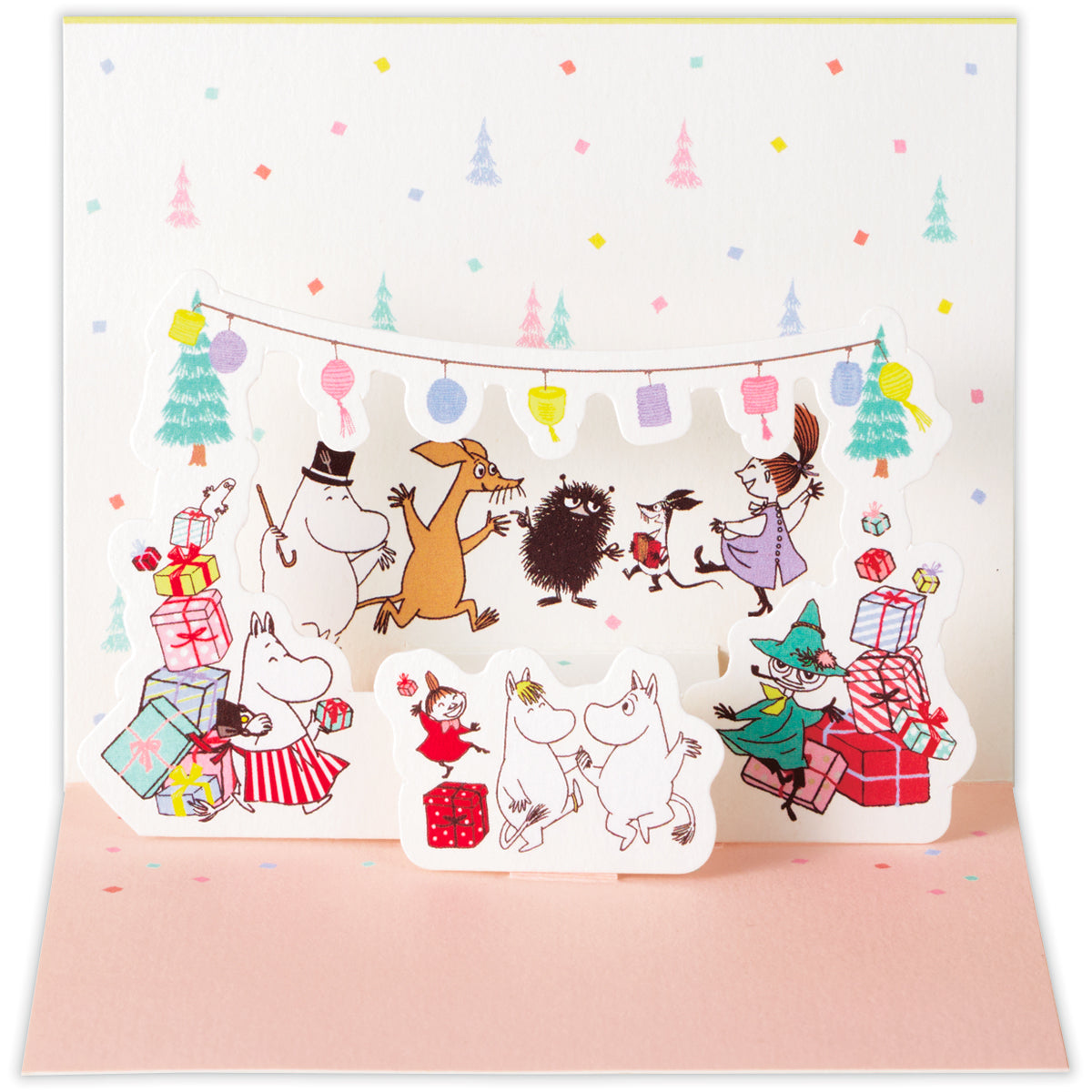 ギフトに添えたりさりげなくメッセージを贈ったり…そんなシーンにぴったりのミニカード。誕生日のお祝いに駆け付けるムーミン谷の仲間たちや、カラフルなガーランドが可愛らしく描かれています。