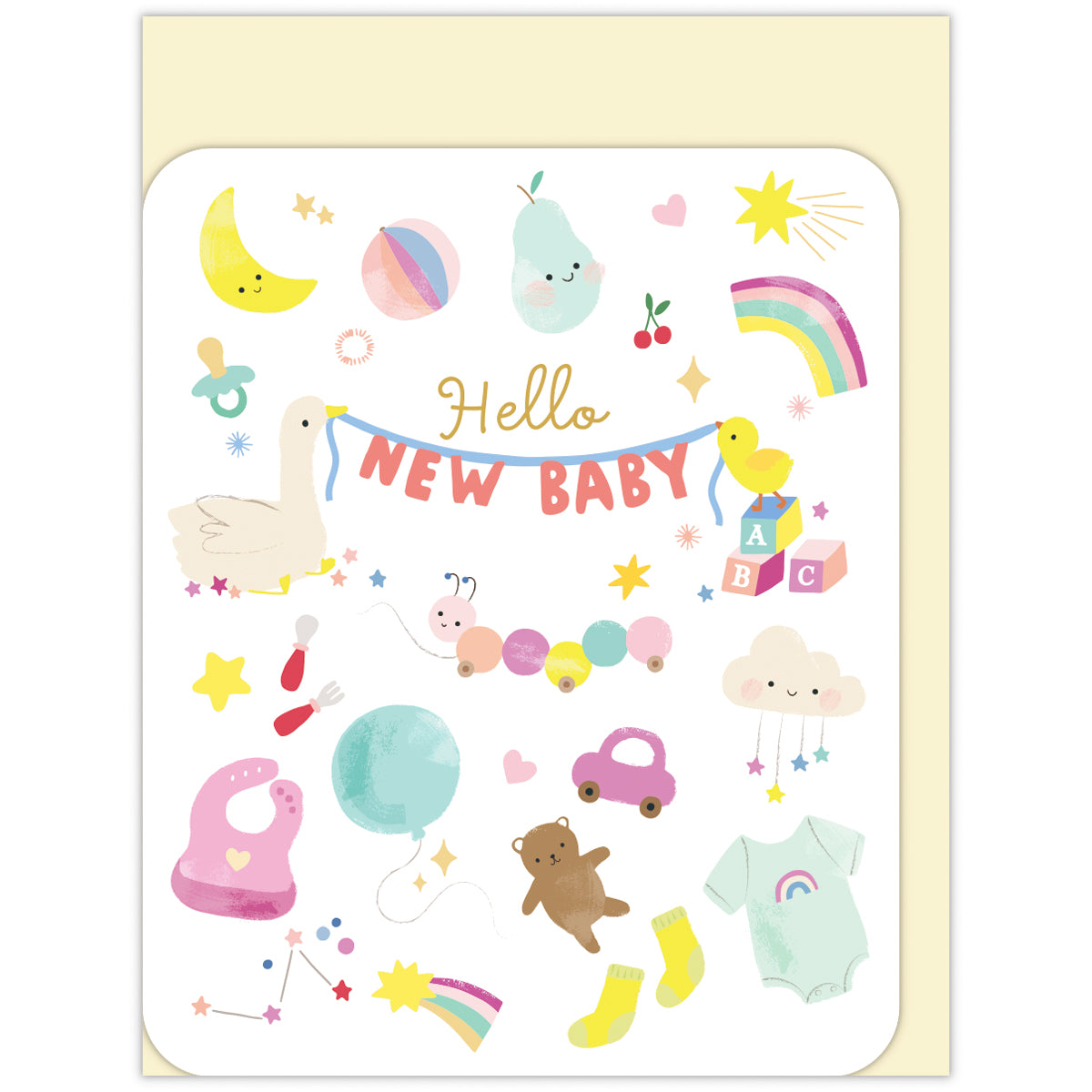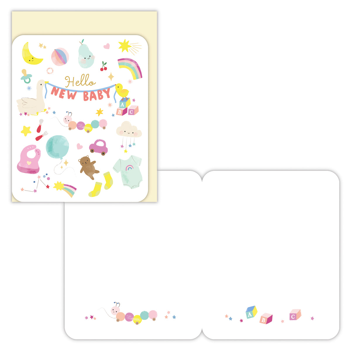 ギフトに添えたりさりげなくメッセージを贈ったり…そんなシーンにぴったりのミニカード。おもちゃやスタイ、ロンパースなど赤ちゃんにまつわるモチーフを優しいパステルカラーで描きました。