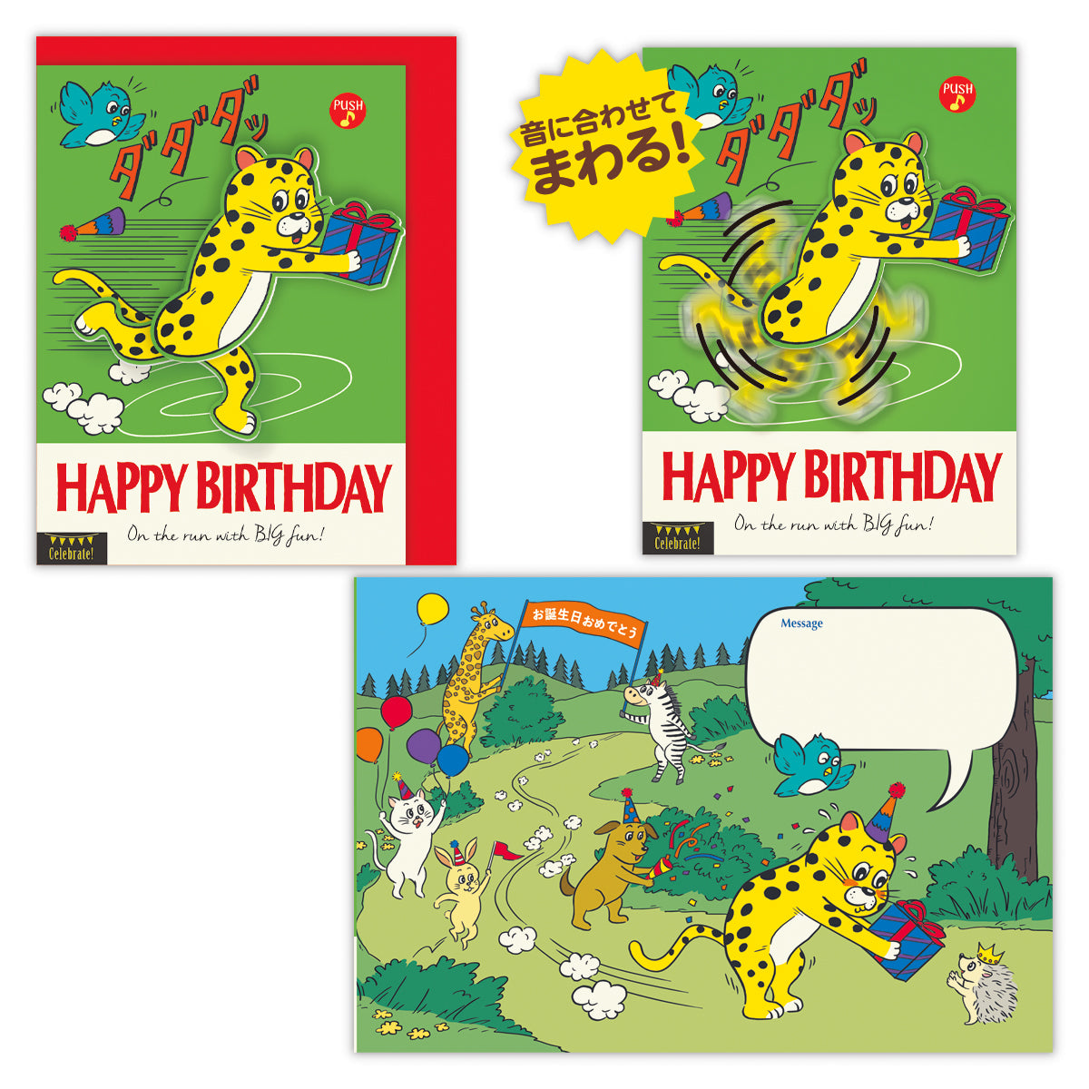 ダッシュでお祝いしたい気持ちをコミック風に表現したユニークなオルゴールカード。ボタンを押すと足の部分がぐるぐる回る仕掛け付きです。バースデーソングは徒競走に使われる曲をイメージした軽やかなアレンジ。