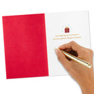 カラフルな水玉模様とキラキラ輝く星を背景に、プレゼントを持った陽気なサンタクロースのダイカットデザインと楽しいメッセージが特徴。金箔のアクセント、ぬいぐるみのようなファブリックのトリム、ベルベットのような赤いフロッキング、ポンポンのアタッチメント、3Dダイカット。思わず触れたくなる立体感・素材感です。