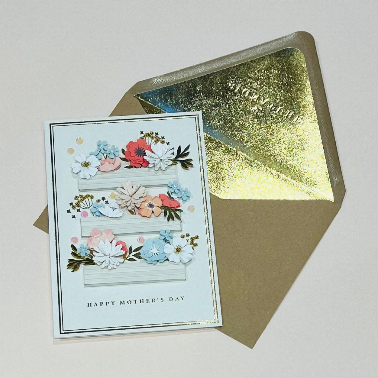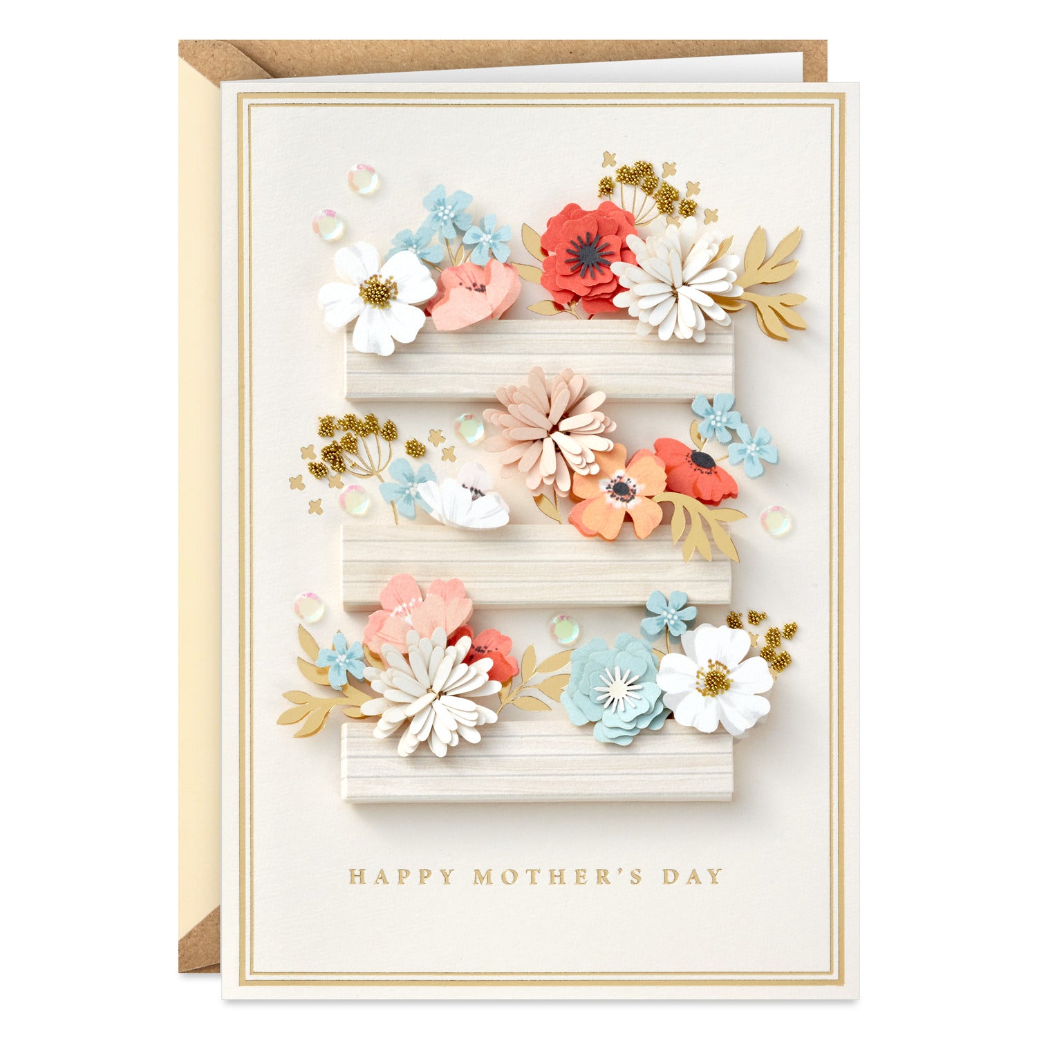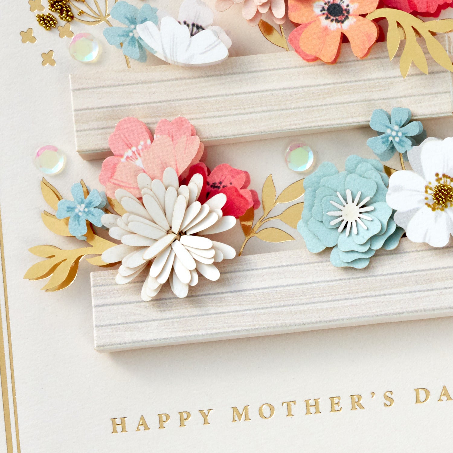 3Dのフラワーボックス、ビーズ、きらめくスパンコールがあしらわれた美しいホールマーク・シグネチャーの母の日カードで、母の日のお祝いを伝えましょう。