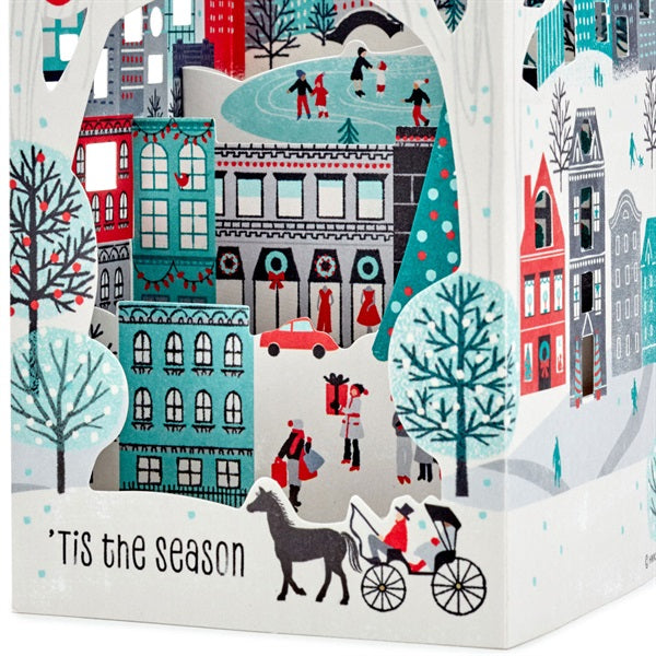 クリスマスショッピングやスケートリンクを楽しむ街角を表現したクリスマスカード。どの角度から見ても楽しめる、クリスマスの街の一角をきりとったレーザーカット加工の立体クリスマスカードです。