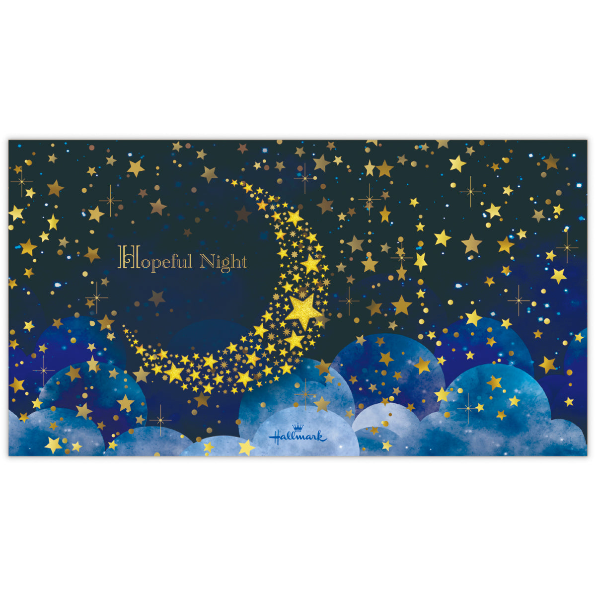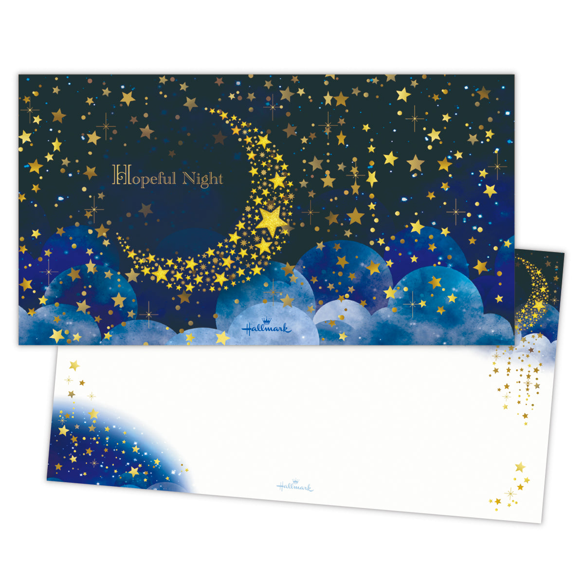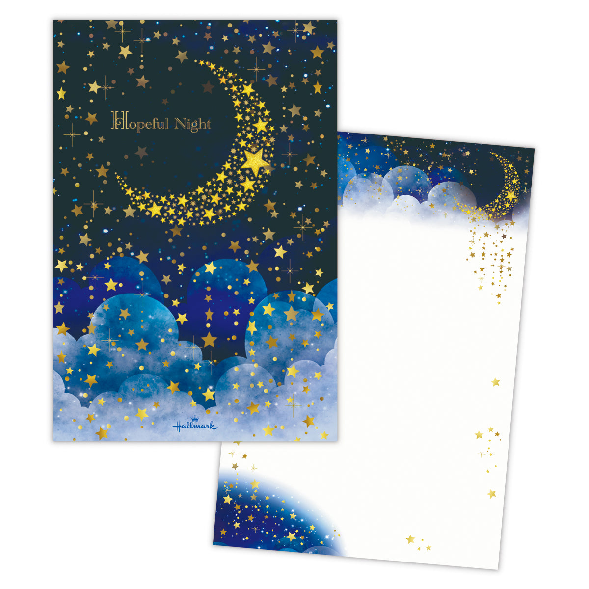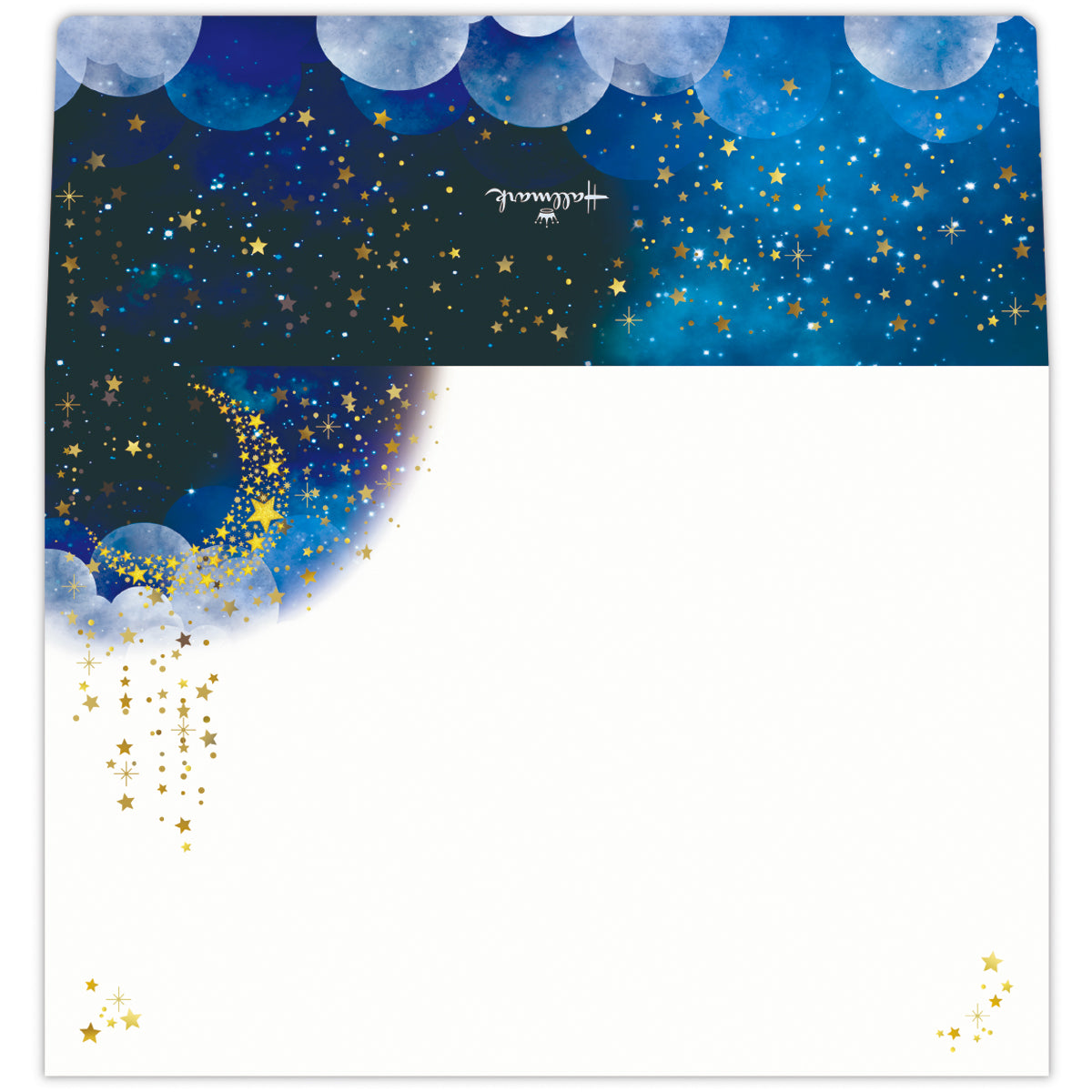 輝く三日月が星を降らせ、美しい夜空をつくり出す様子を描きました。ブルーの濃淡で表現された奥行きある空に、金箔加工の月や星が映える幻想的なデザイン。罫線なしタイプなので、お手紙だけでなくイラストなど幅広くお楽しみいただけます。 -