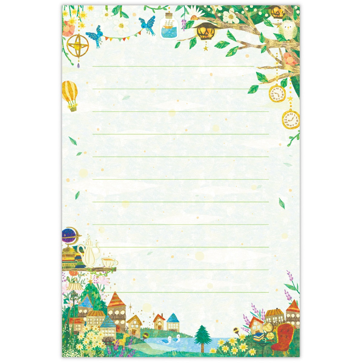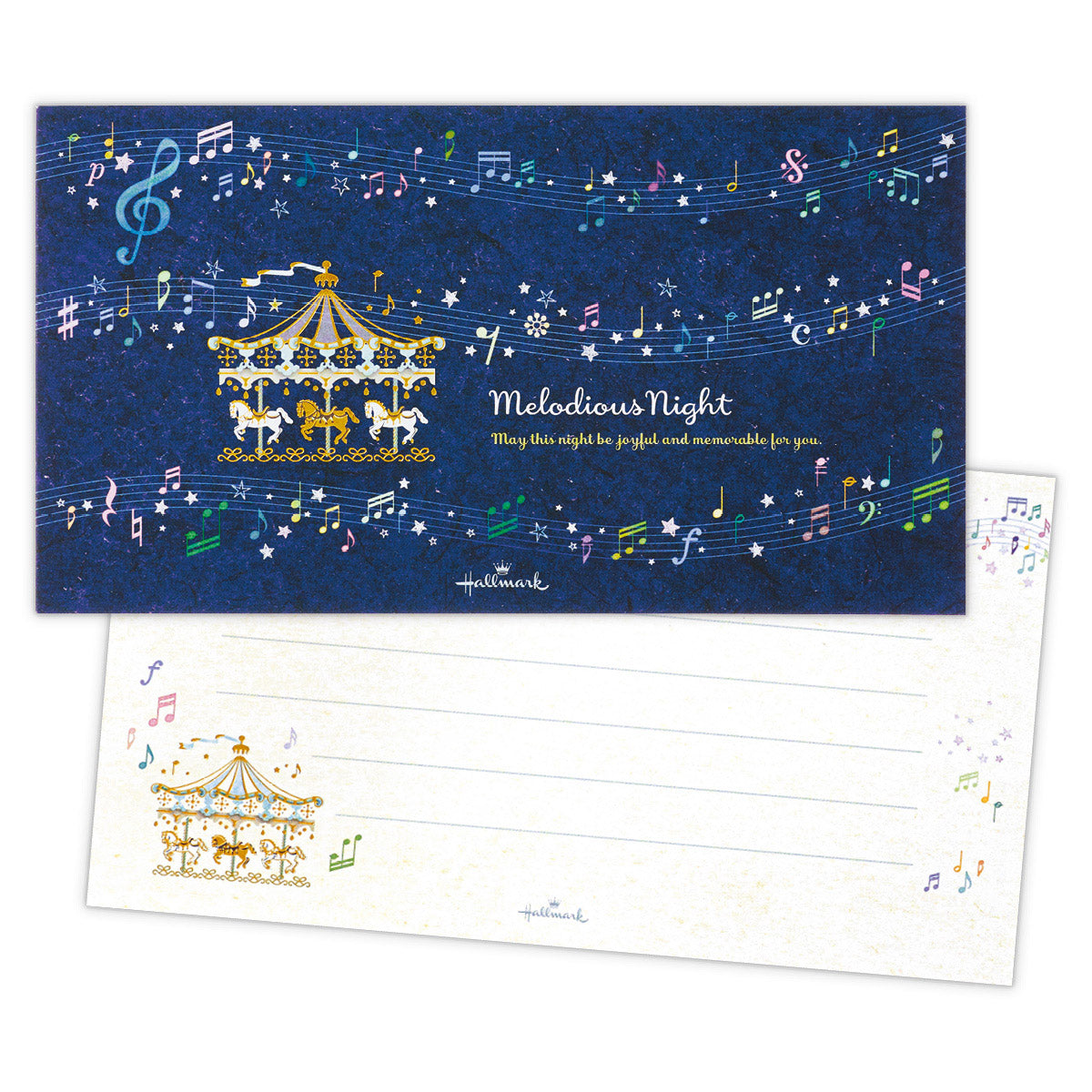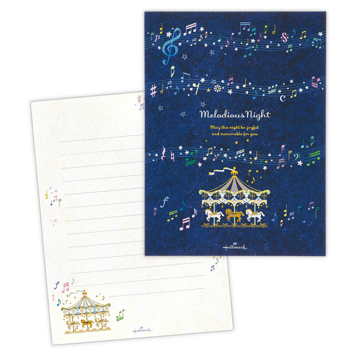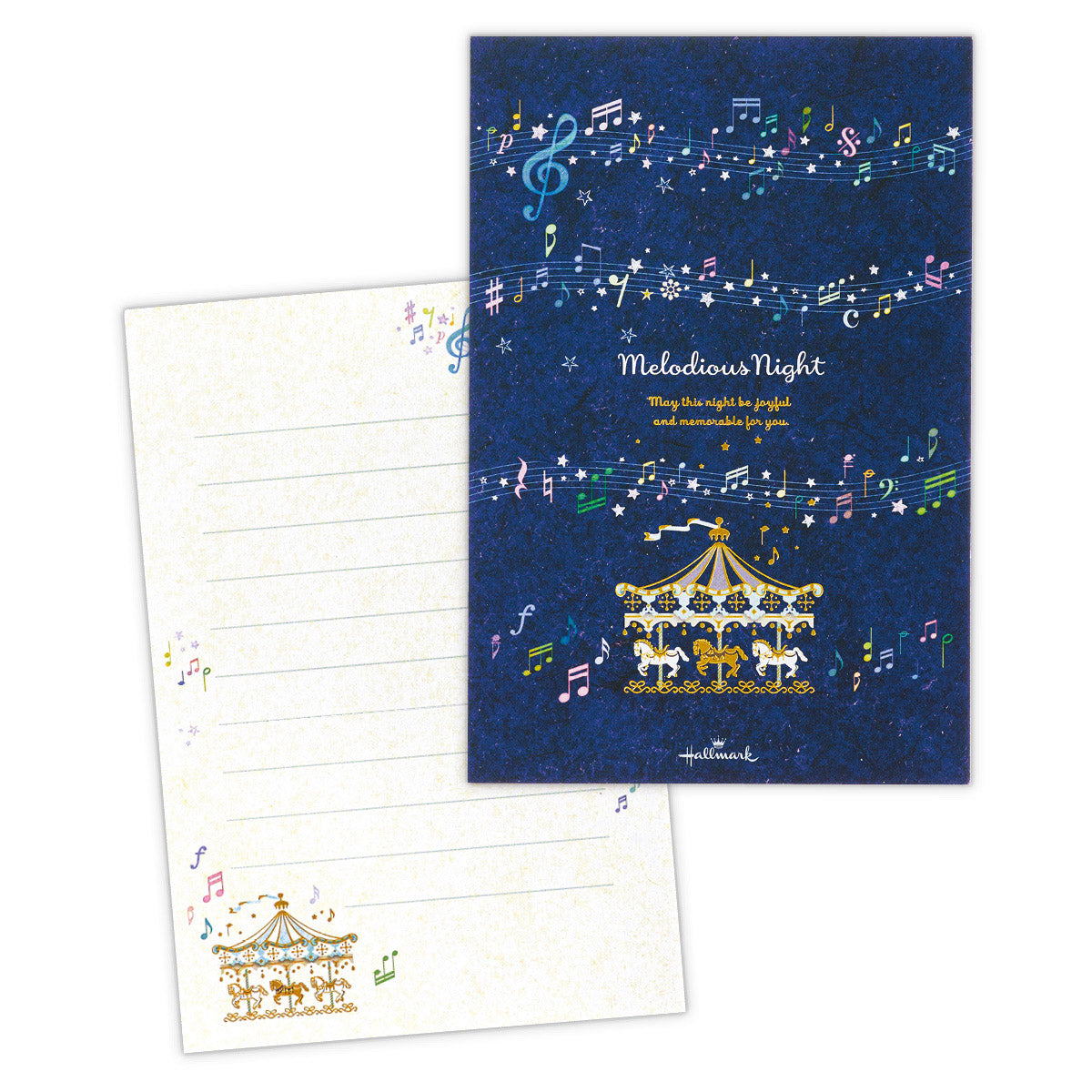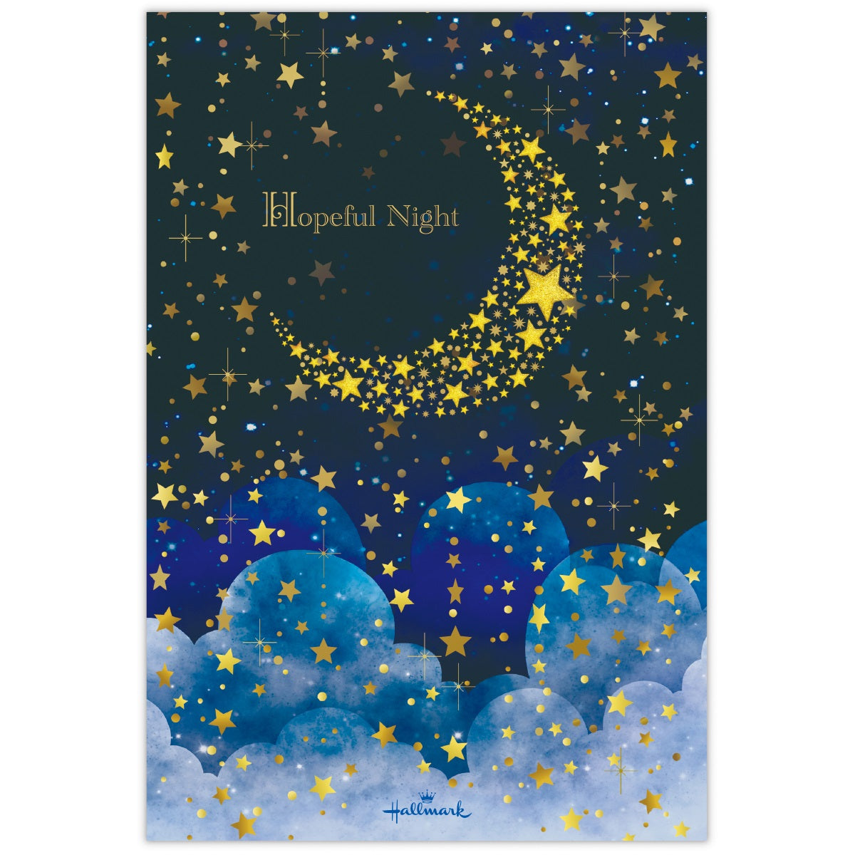 輝く三日月が星を降らせ、美しい夜空をつくり出す様子を描きました。ブルーの濃淡で表現された奥行きある空に、金箔加工の月や星が映える幻想的なデザイン。罫線なしタイプなので、お手紙だけでなくイラストなど幅広くお楽しみいただけます。 -