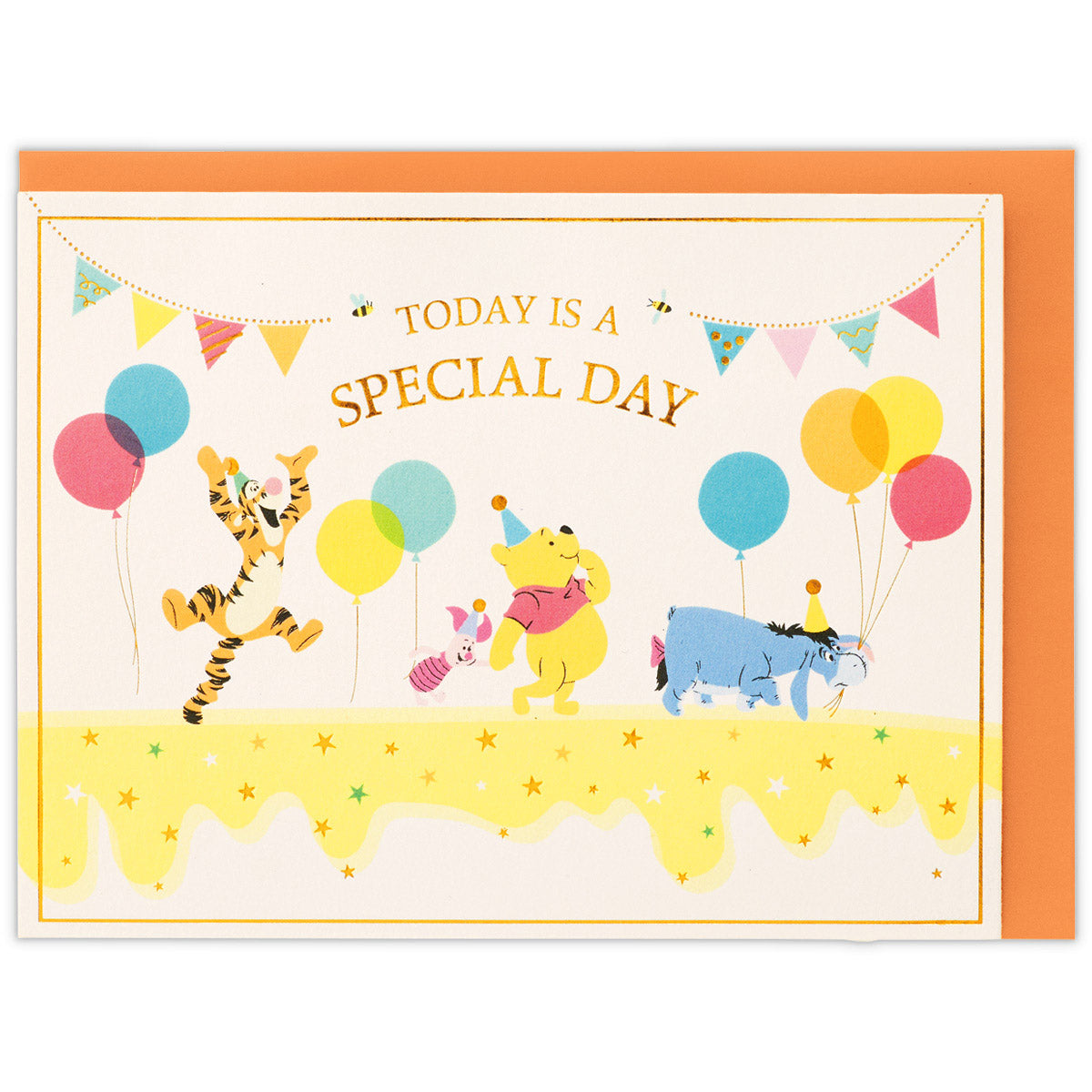パーティー帽子でおめかし! プーと仲間たちのキュートなバースデーカードです