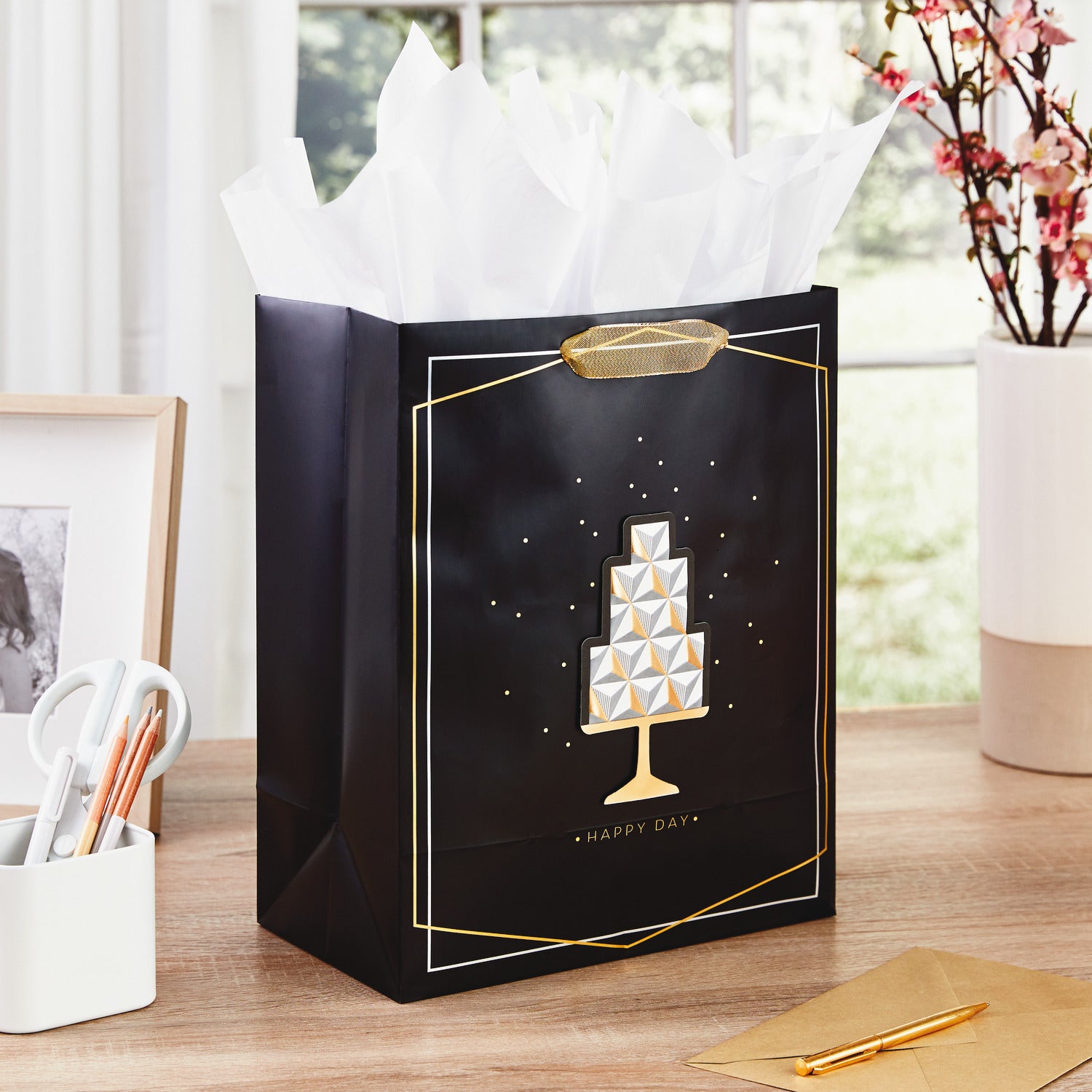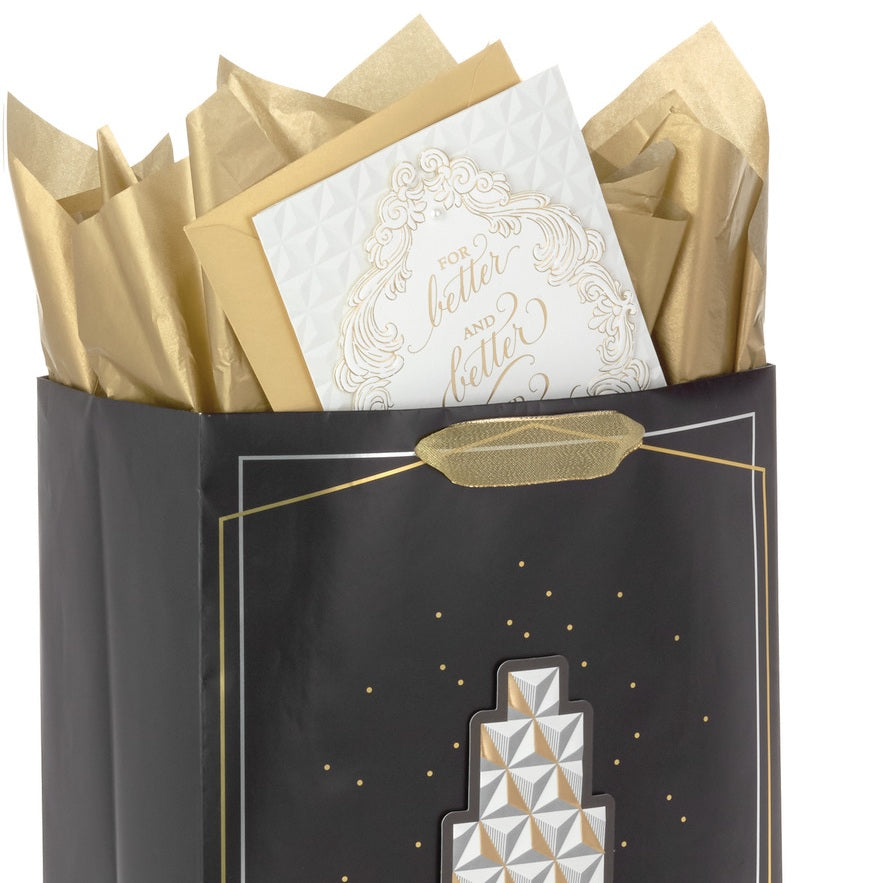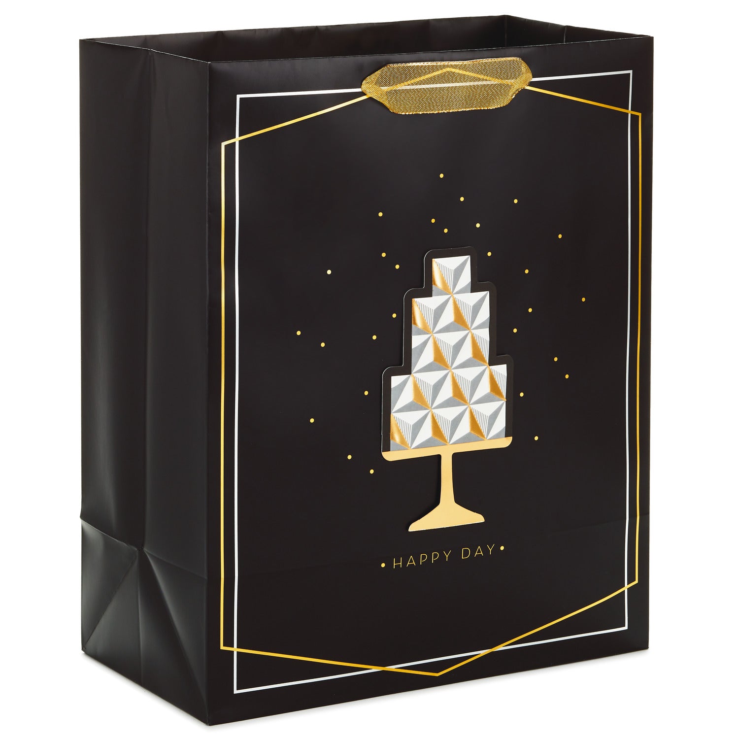 黒地にゴールドとシルバーのデザインが映える、特別な日に贈りたい大きめギフトバッグ。グリーティングカードを入れるためのポケットがついています。とっておきのお祝い事や、たくさんのギフトの中で個性を出したいときにぴったり!