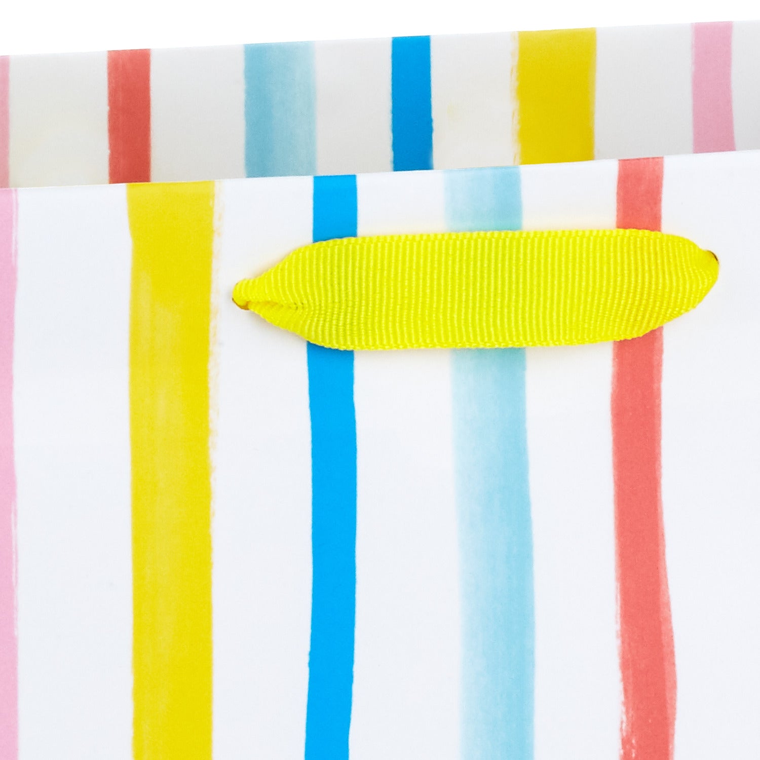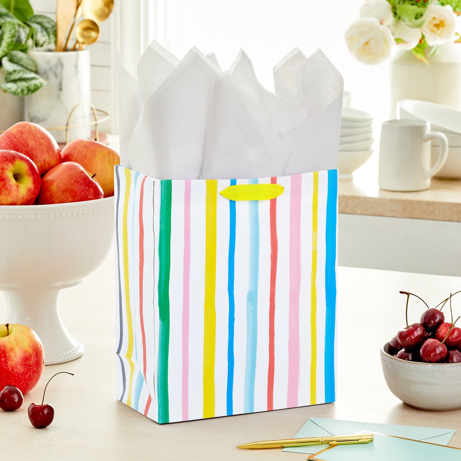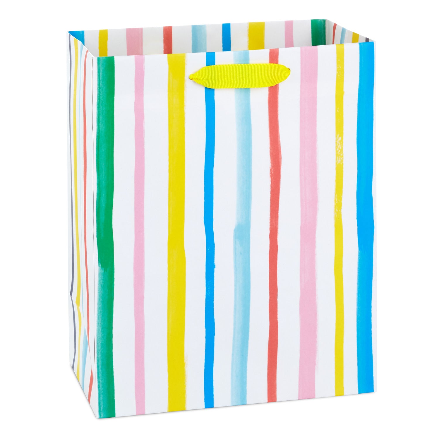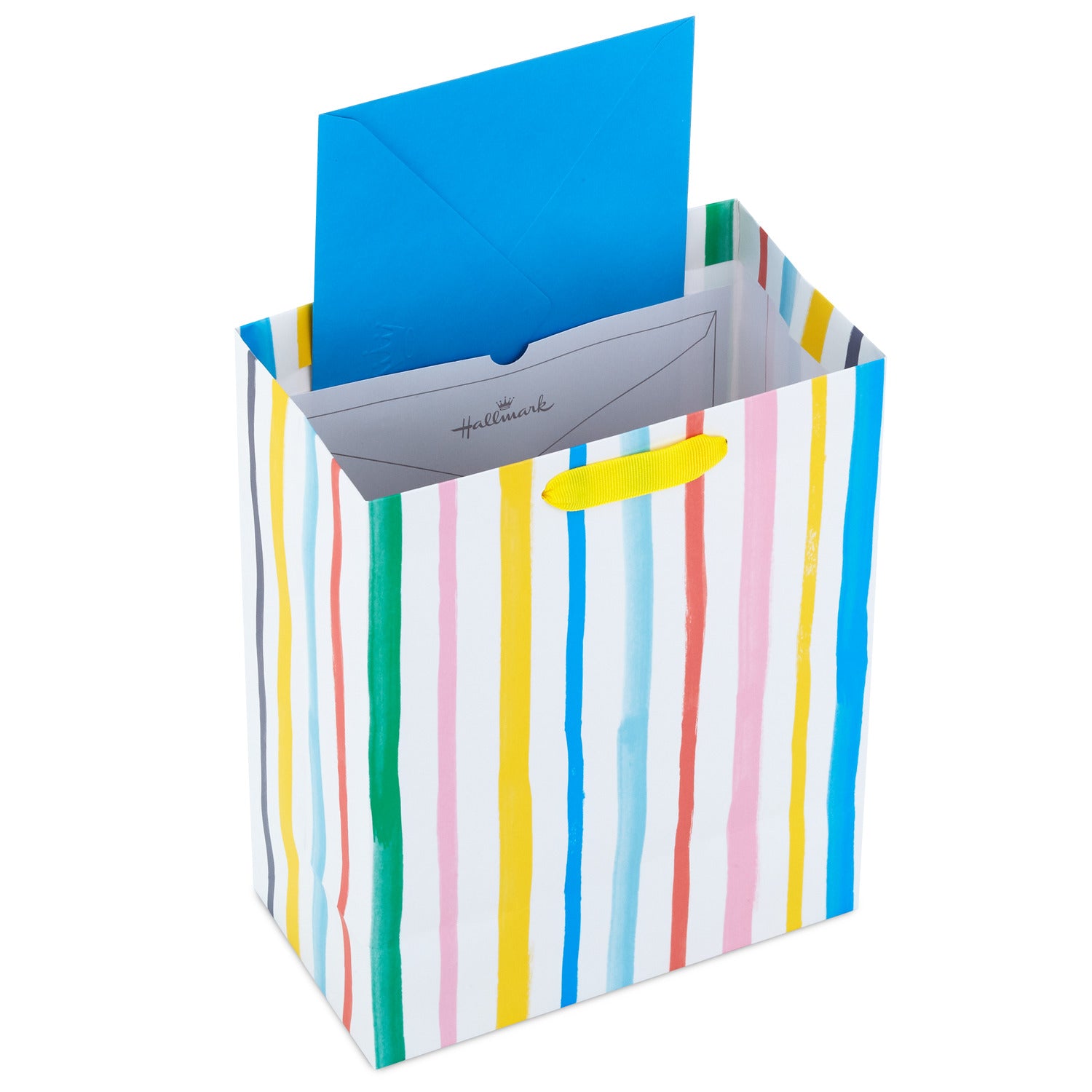 カラフルなレインボーのストライプが描かれたギフトバッグ。グリーティングカードを入れるためのポケットがついています。とっておきのお祝い事や、たくさんのギフトの中で個性を出したいときにぴったり!